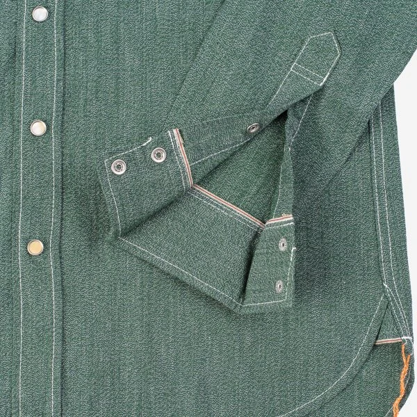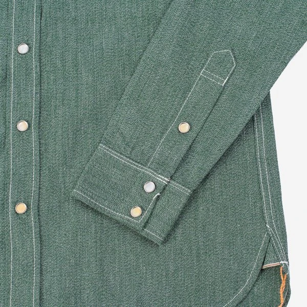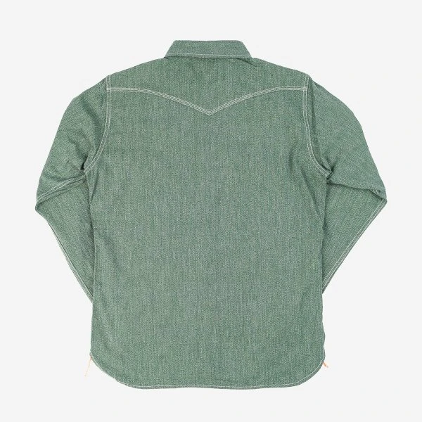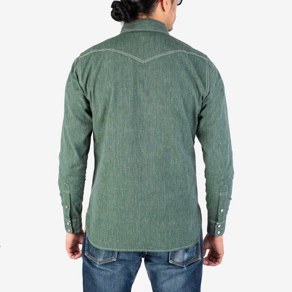 Our classic western shirt design, made in Japan from a traditional green mock twist chambray. A mock twist chambray weave gives the fabric a distinctive “salt and pepper” look and is particularly hard-wearing.
