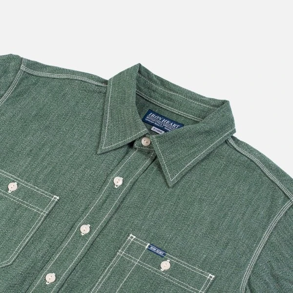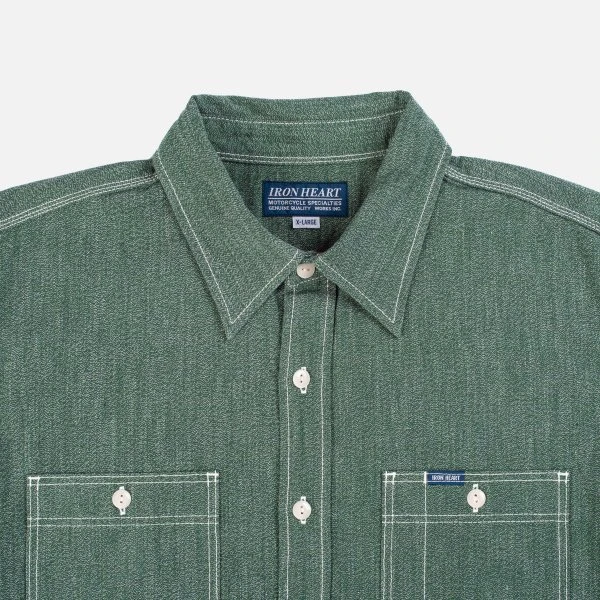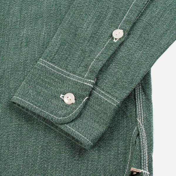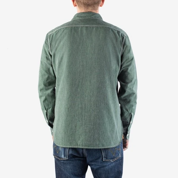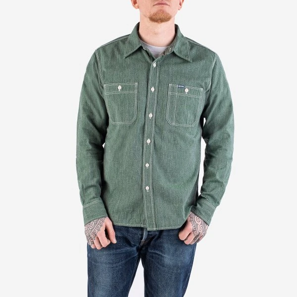 Our classic work shirt design, made in Japan from a traditional green mock twist chambray. A mock twist chambray weave gives the fabric a distinctive “salt and pepper” look and is particularly hard-wearing.