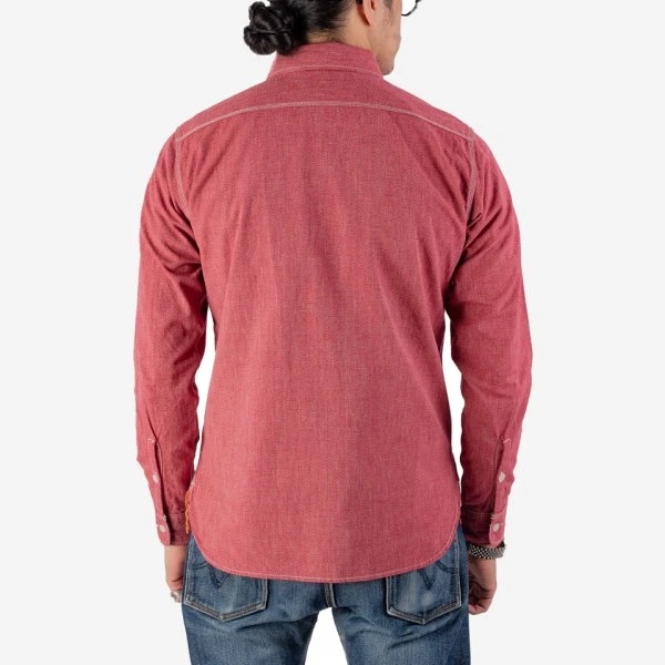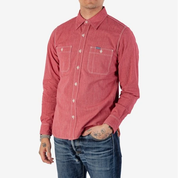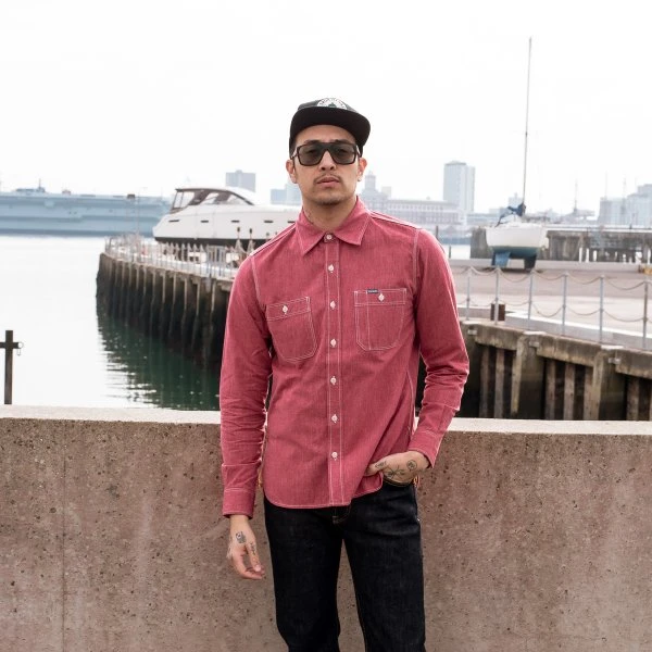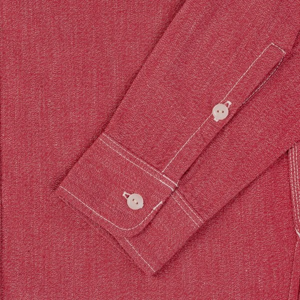 Our classic work shirt design, made in Japan from a traditional red mock twist chambray. A mock twist chambray weave gives the fabric a distinctive “salt and pepper” look and is particularly hard-wearing.”