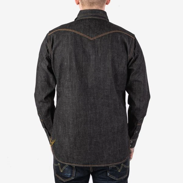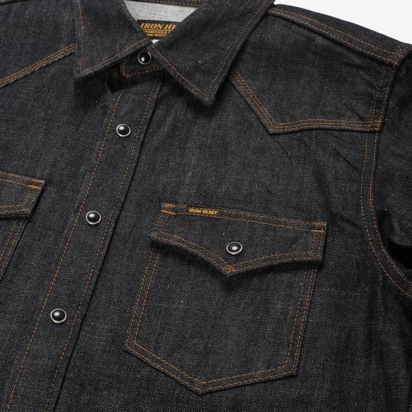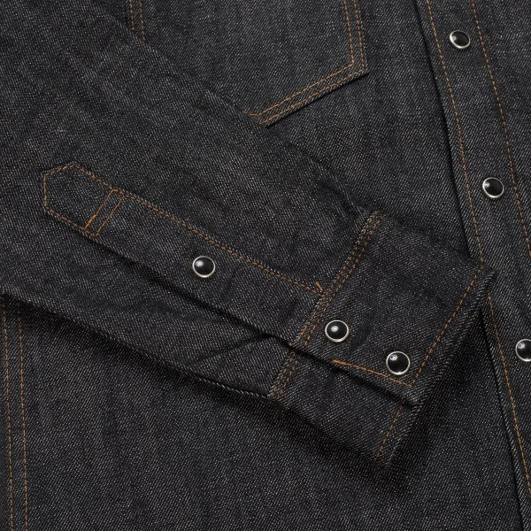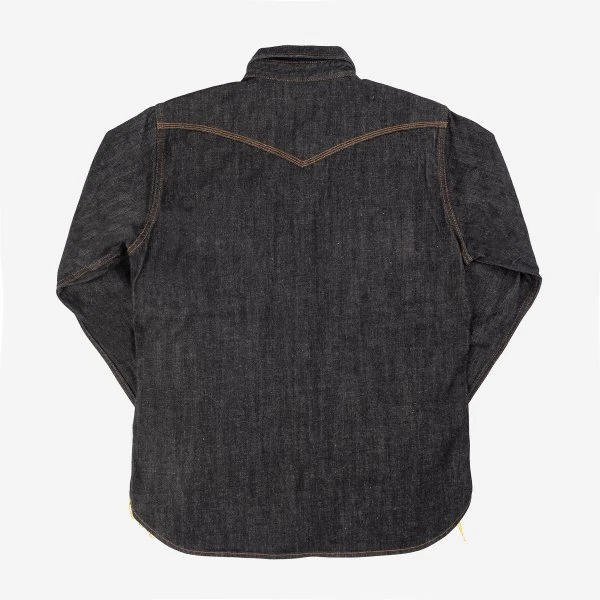 Our classic western shirt made from one-washed 12oz black sulphur dyed warp and cream weft Japanese selvedge denim. With dark gold contrast stitching and black Iron Heart Permex snaps, this shirt is a must-have wardrobe staple.
