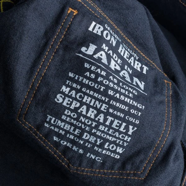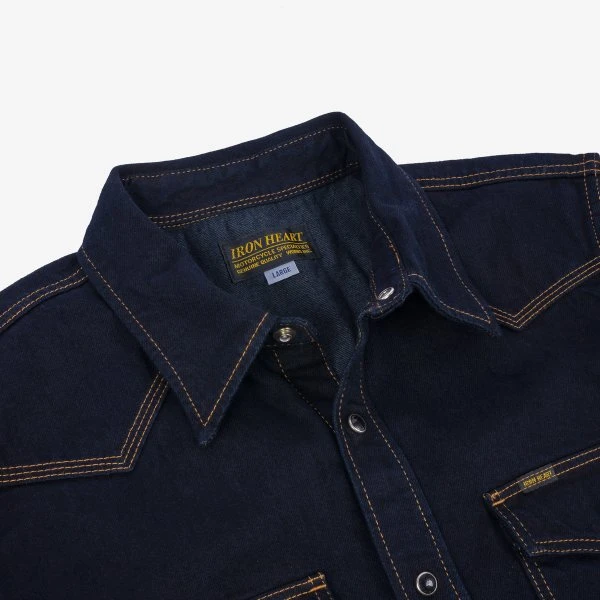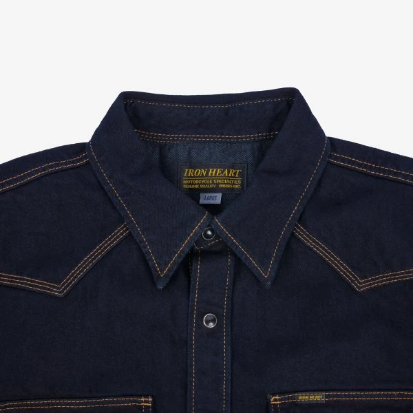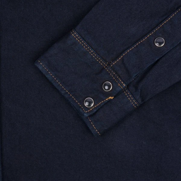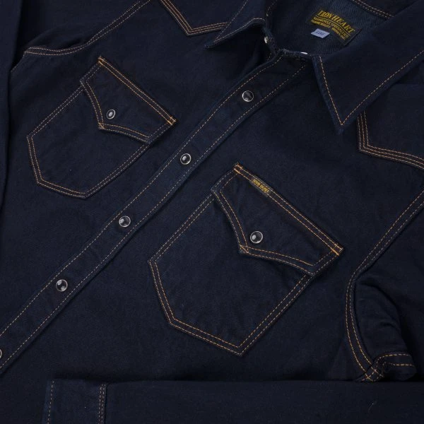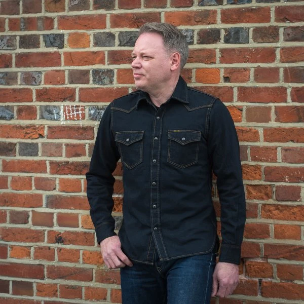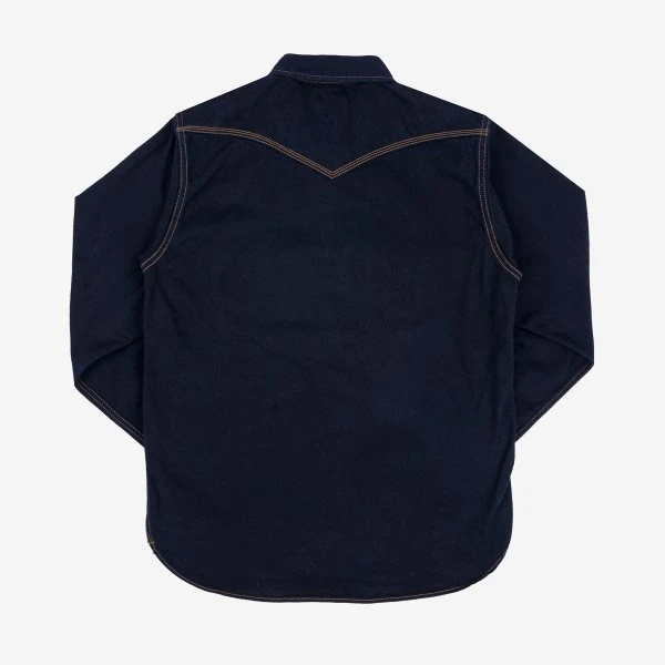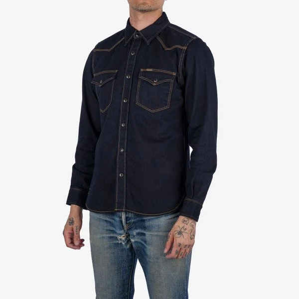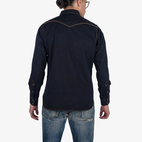 Our classic western shirt made from rinsed 12oz indigo Japanese selvedge denim overdyed in black, and finished with chain stitch run-off and Iron Heart black Permex snaps. This shirt is a must-have wardrobe staple.