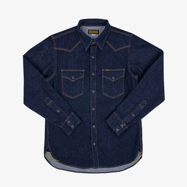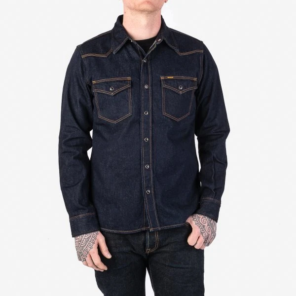 Our classic western shirt made from one-washed 12oz indigo Japanese selvedge denim, with black Iron Heart Permex snaps and dark gold contrast stitching. A staple shirt that will age beautifully over time.