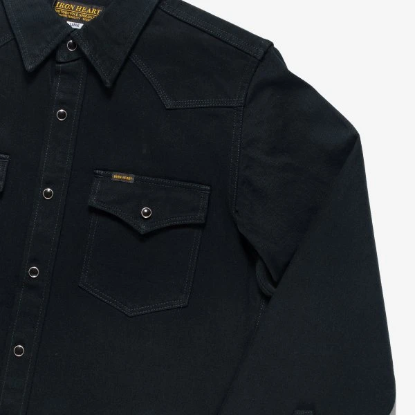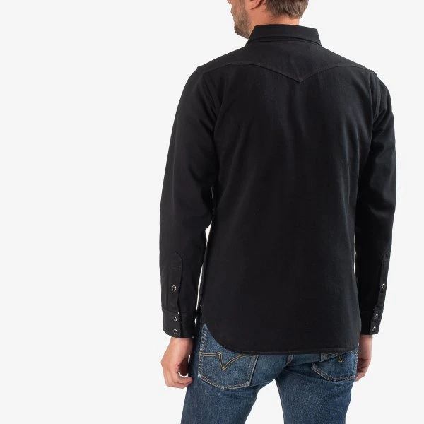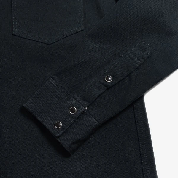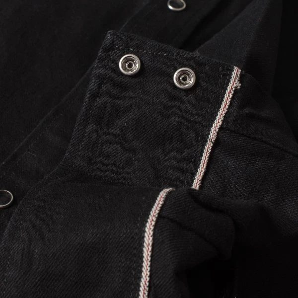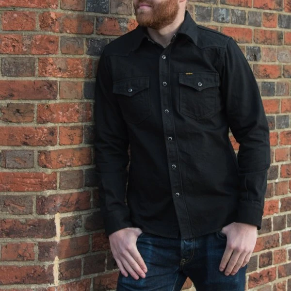 The Man in Black’ is again the inspiration for this black denim western shirt, AKA ‘The Johnny Cash III’. The 12oz black selvedge denim has both a reactively dyed warp and weft meaning that the shirt will retain its stealth look through wear and washing.
