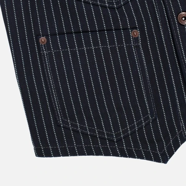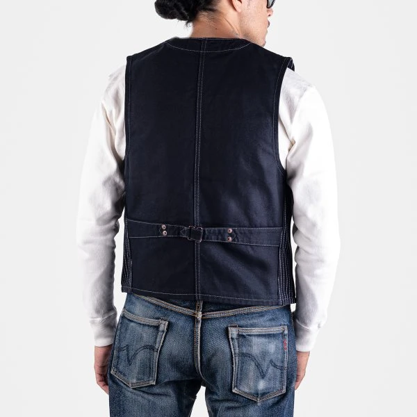 This 12oz work vest is constructed using a indigo sulphur dyed wabash face, backed with a navy duck canvas. Easily layered over a t-shirt in the spring or under a jacket in the winter, it’s a solid all year-round piece, and with the warp and weft both being rope dyed, you are sure to see plenty of evolution the more it is worn.