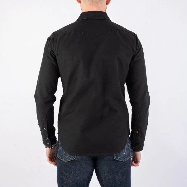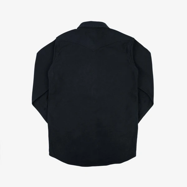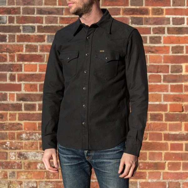 Our classic western cut shirt in a sulphur-dyed black military grade heavy cotton serge, with tonal black snaps, and made with our usual fantastic attention to detail. Being sulphur-dyed, this fabric will fade over time.Â