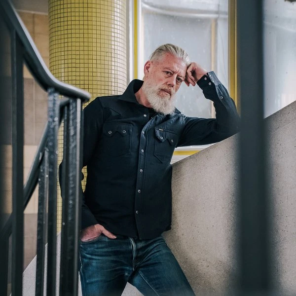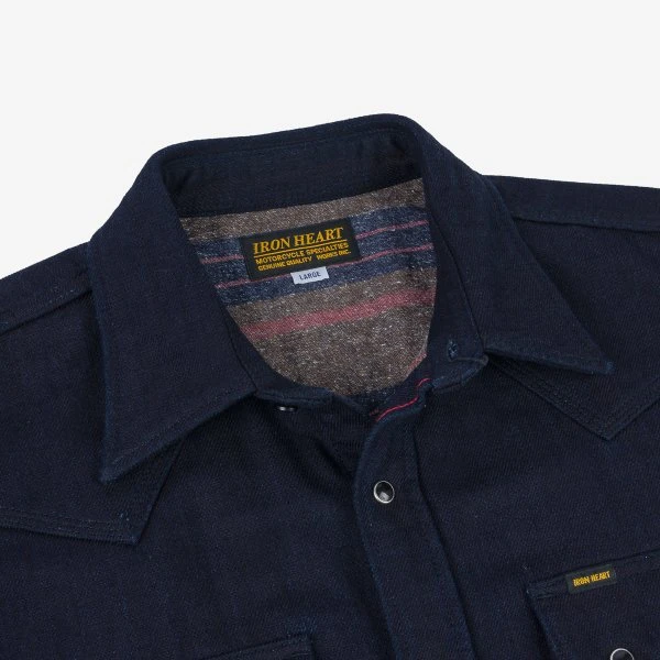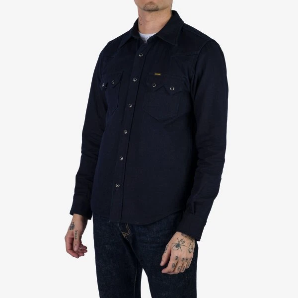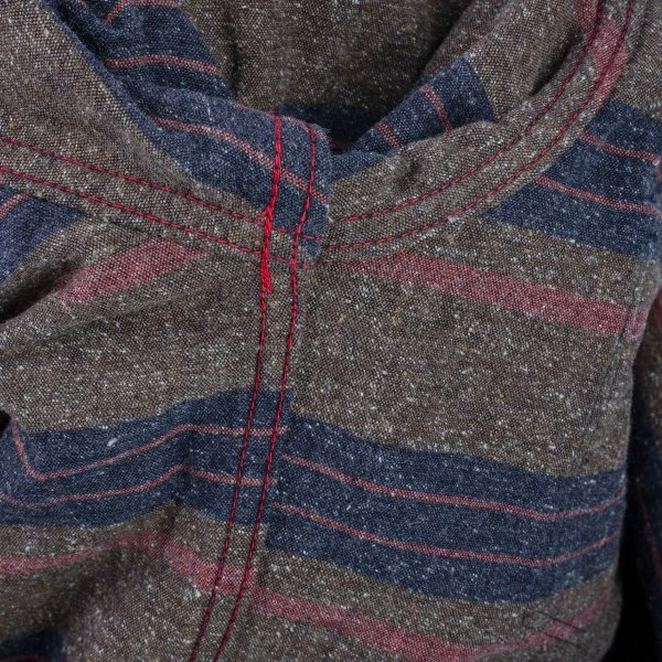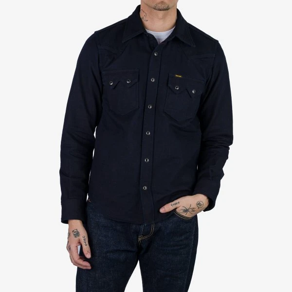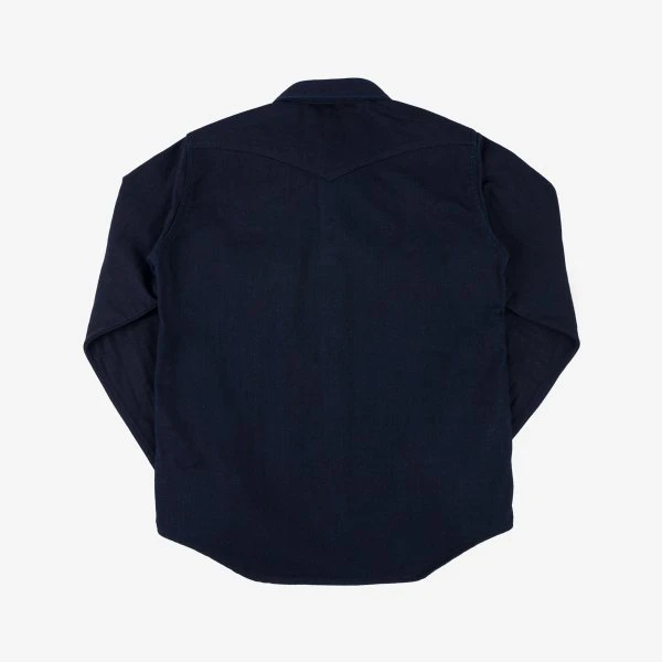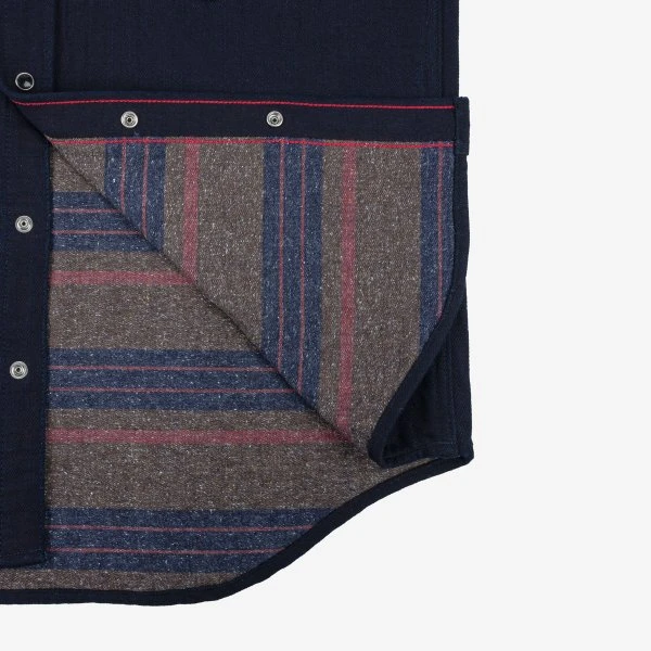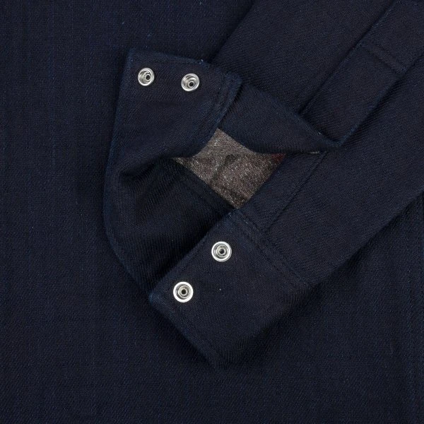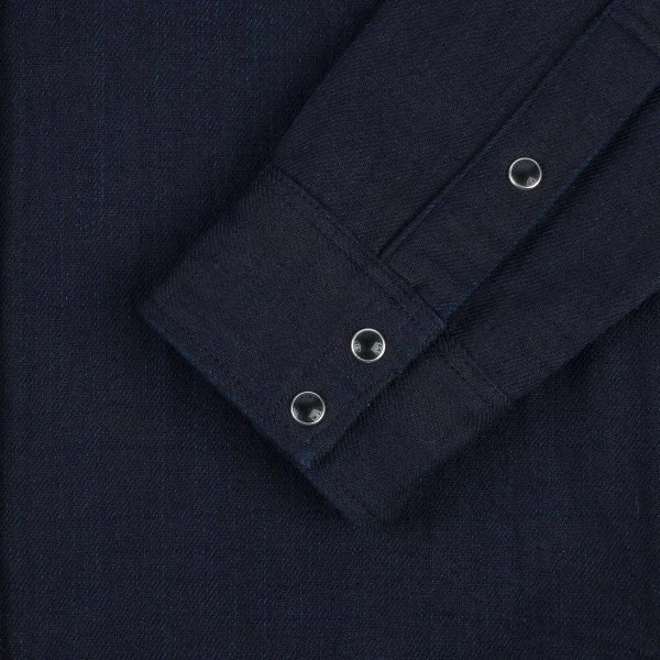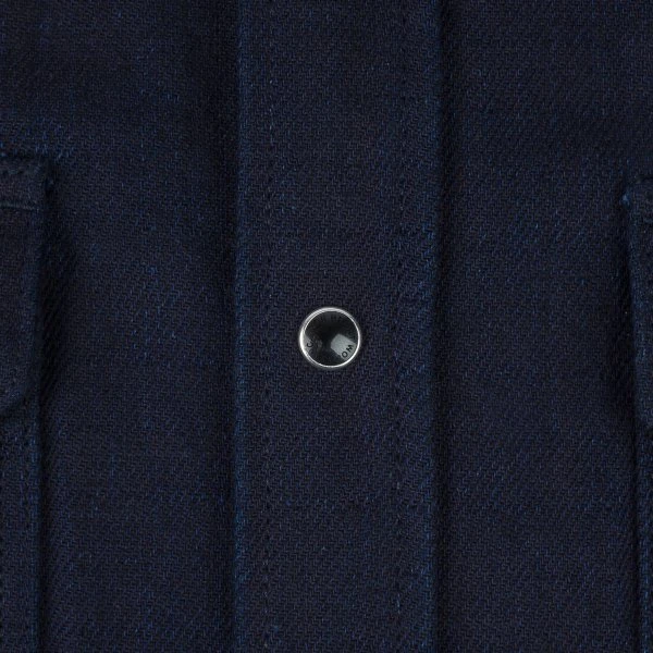 Woven on a dobby loom to create a more pronounced texture, this particular double-cloth utilises a cotton / poly / acrylic blend. With its indigo rope-dyed face and a patterned reverse, the result is a substantial feeling fabric which is both soft and durable, creating a visually striking, heavyweight shirt that’s perfect for the colder months.
