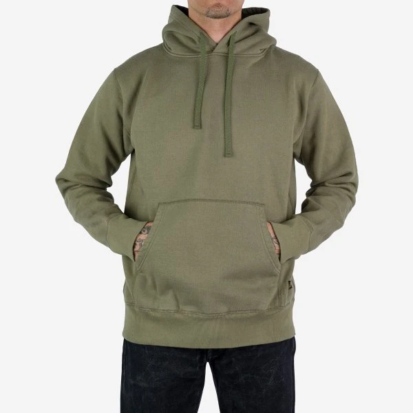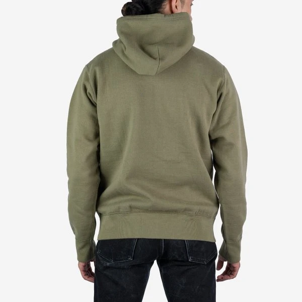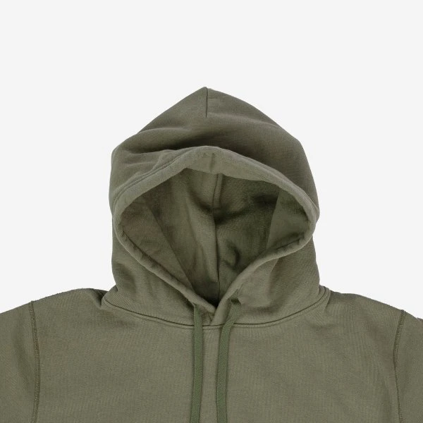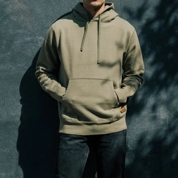 Ultra heavy and super comfy pull-on loopwheel fleece-lined hoodie, with a large front pouch and handwarmer pocket. Woven in Wakayama and constructed using four needle Union Special flat stitched seams.