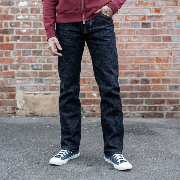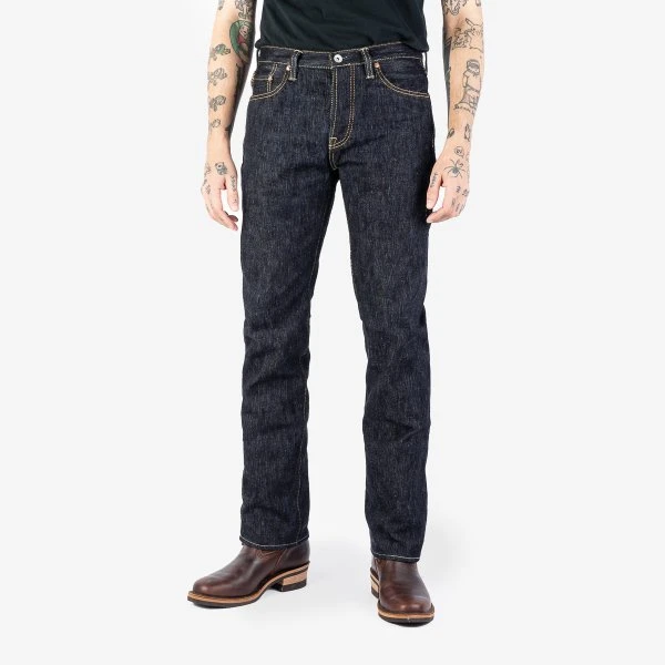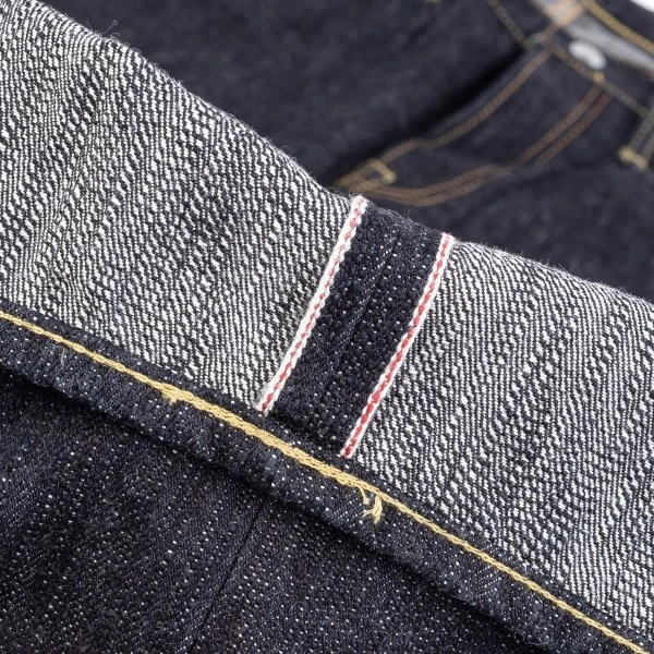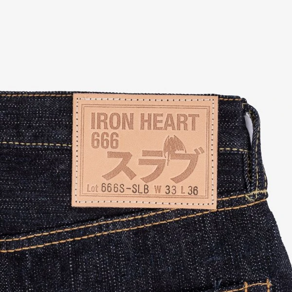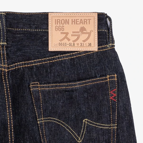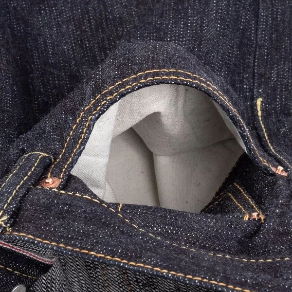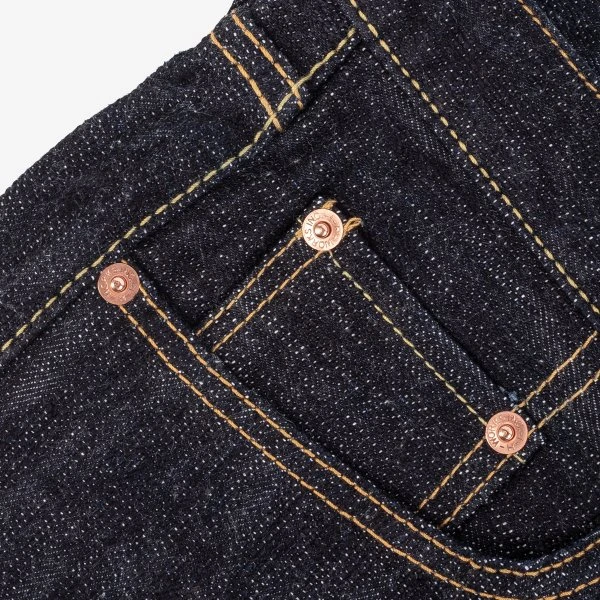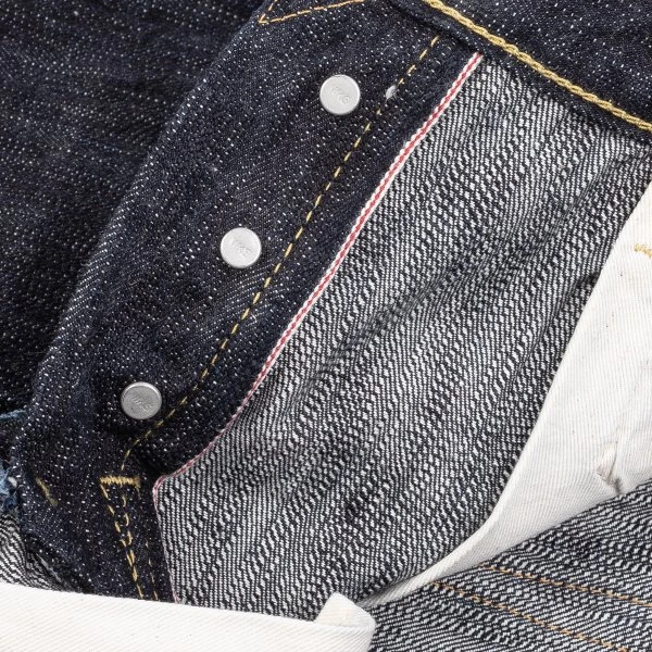 A first for Iron Heart, a slubby denim. This deep indigo selvedge denim has a really uneven hand on both the face and reverse (think off the scale loom-chatter), but at the same time, it is incredibly soft and comfortable to wear.