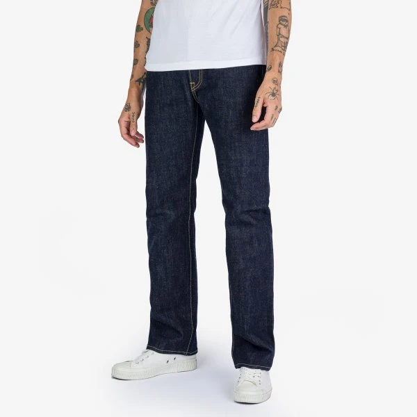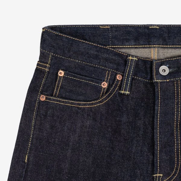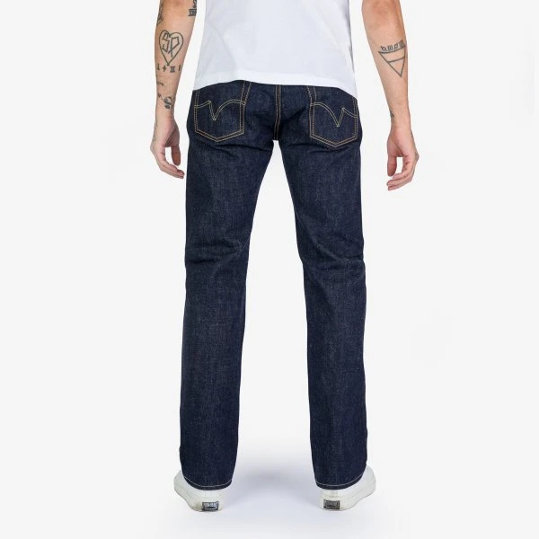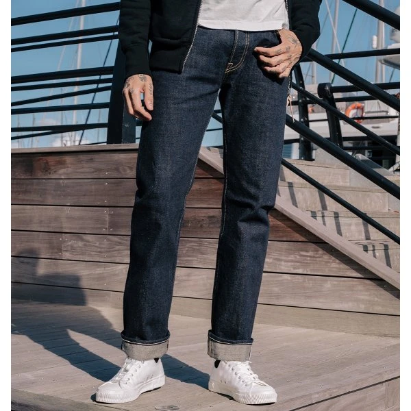 Our medium rise straight slim cut, constructed from 17oz natural indigo/organic cotton selvedge denim. Initially, this denim will be very reluctant to give up its indigo and takes a long time to start fading. However, once fade patterns do start to develop, they will do so with lots of contrast.