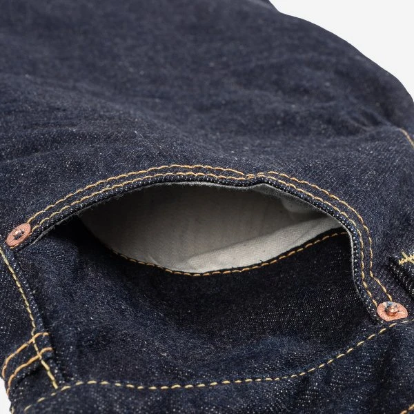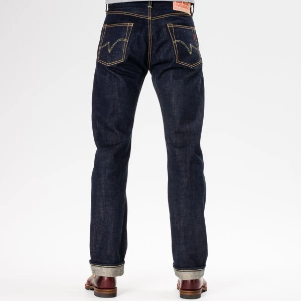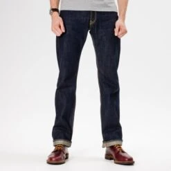 Our medium rise straight cut, constructed from 17oz natural indigo/organic cotton selvedge denim. Initially, this denim will be very reluctant to give up its indigo and takes a long time to start fading. However, once fade patterns do start to develop, they will do so with lots of contrast.