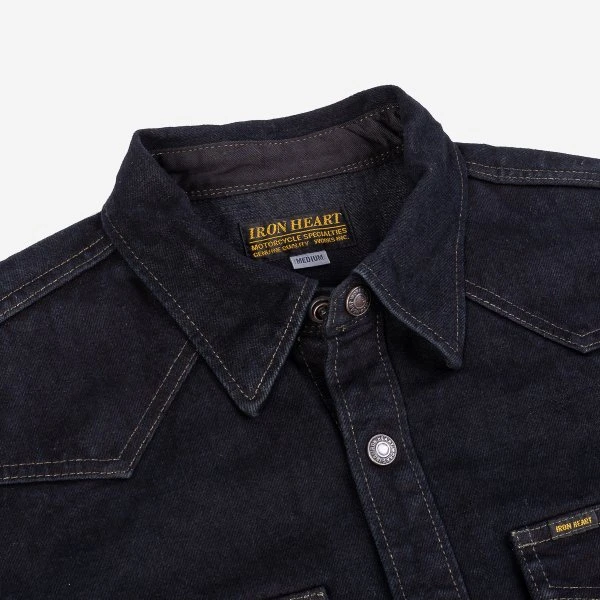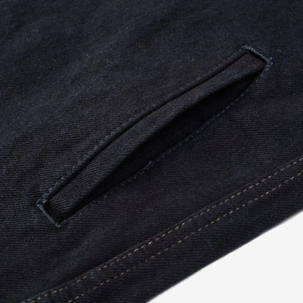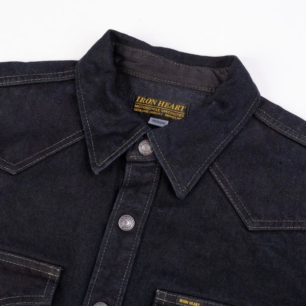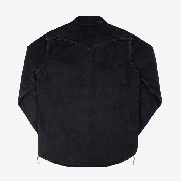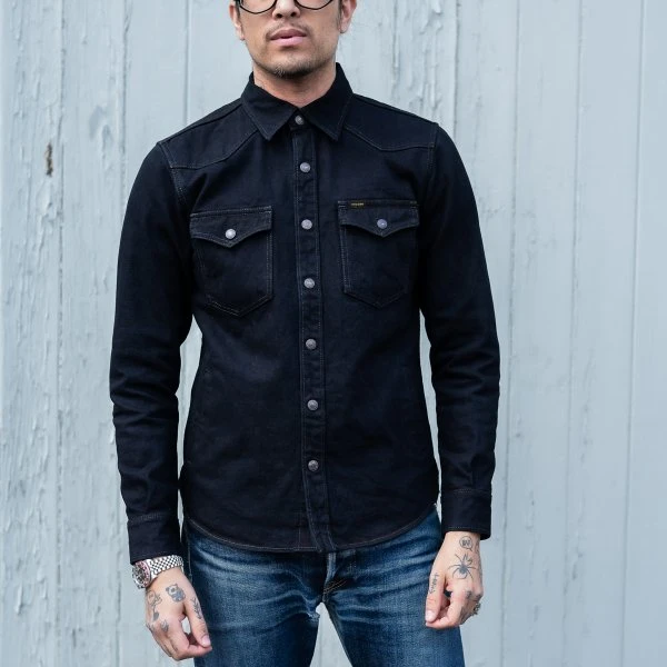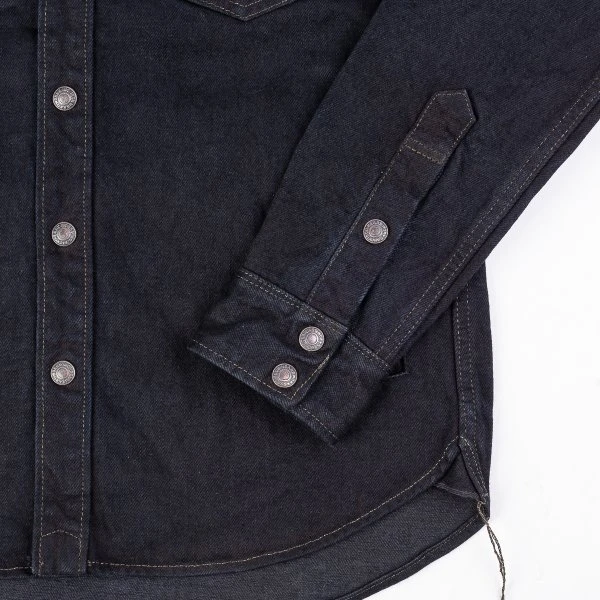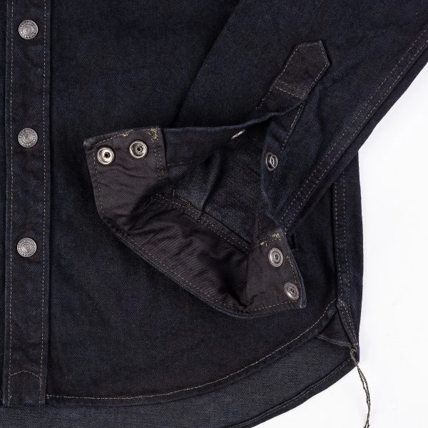 Our western style CPO shirt, built using overdyed 18oz vintage indigo Japanese selvedge denim. The black sulphur overdye gives this shirt a little more heft (as it tightens up the fabric) and distresses the oversized copper snaps beautifully. Finished with twill lined cuffs, collar stand, and side pockets. This shirt will become a firm favourite for years to come.