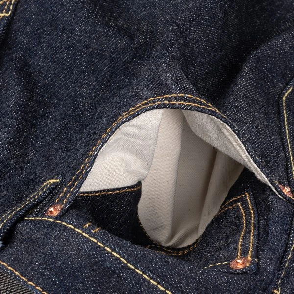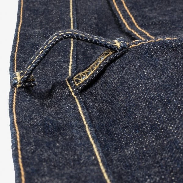 - 18oz rope dyed indigo warp, natural weft Japanese selvedge denim