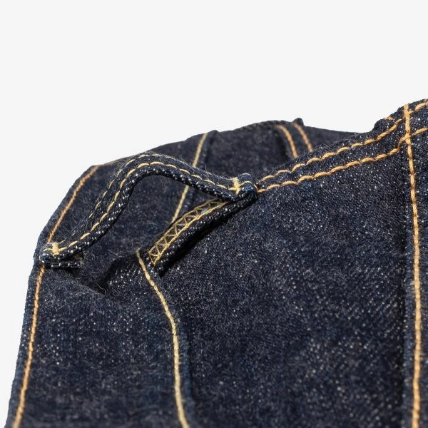- 18oz rope dyed indigo warp, natural weft Japanese selvedge denim