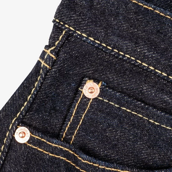 Our relaxed tapered cut jeans, built using 19oz indigo-dyed left-hand twill Japanese selvedge denim. In a left hand twill, the warp gets tightened during the weaving process resulting in a harder, smoother face to the fabric. Often the denim will appear lighter due to more of the weft being visible on the face of the fabric. This 19oz denim has been dipped in indigo many times to achieve a very dark LHT.