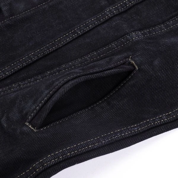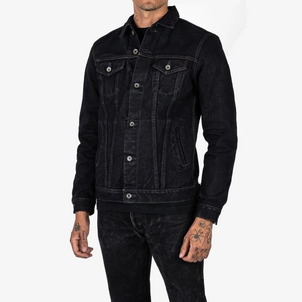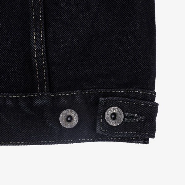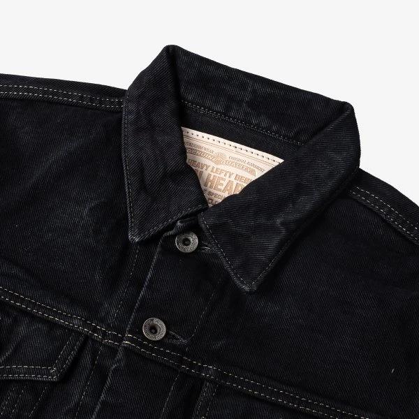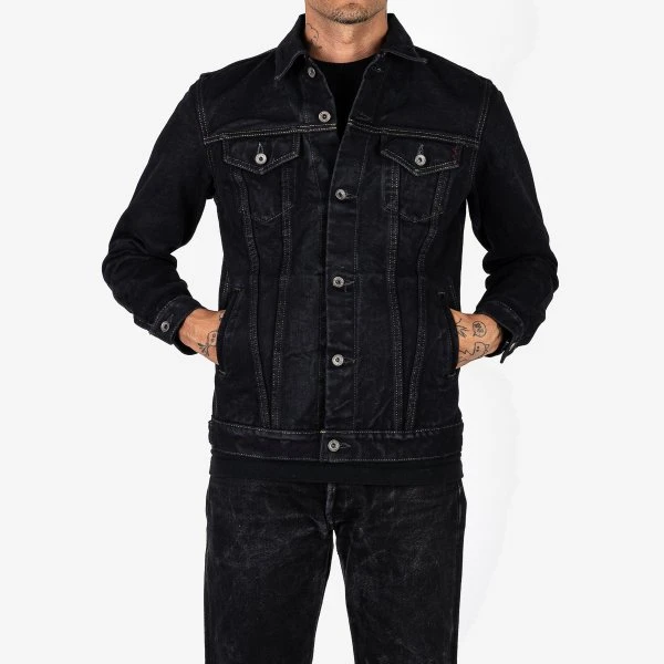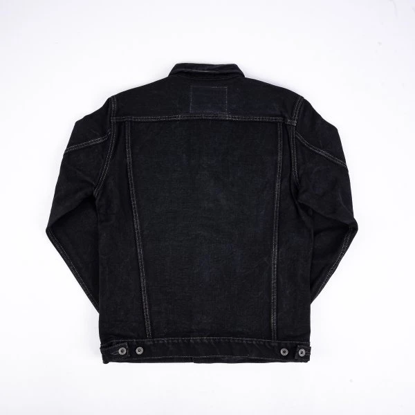 Our classic Type III jacket, modified with a slightly longer than traditional body and the addition of side handwarmer pockets. This version is made from our incredibly robust 19oz left hand twill denim and then steeped in black sulphur dye – the denim starts out as one of the toughest we make, and the overdying process further cranks up the volume – cotton armour.