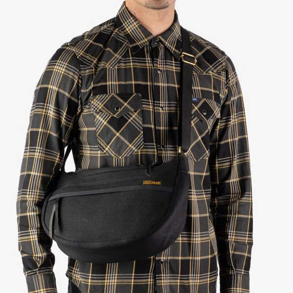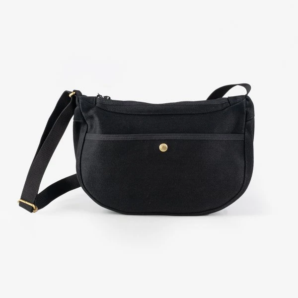 Constructed from 21oz black denim, this is a hardwearing, versatile shoulder bag which offers generous storage capacity considering its smaller size. Multiple storage pockets include a main compartment (easily large enough to fit a 1-litre water bottle, with plenty of room to spare) and a smaller internal pouch for hidden storage of a passport or wallet. Other features include a 1” nylon shoulder strap, YKK zippers, leather zip pulls and brass hardware – an ideal carry bag for your everyday essentials and valuables.