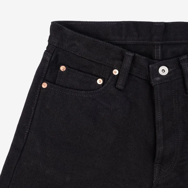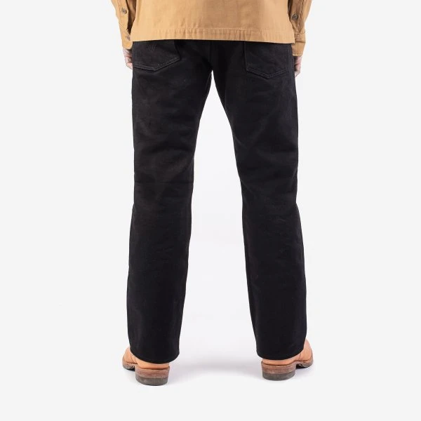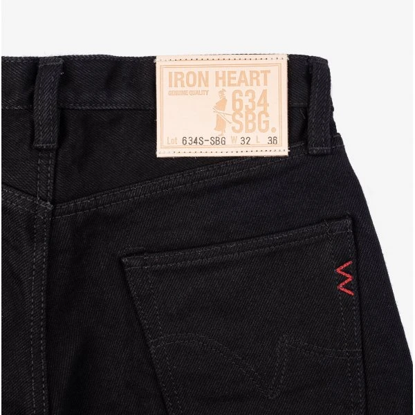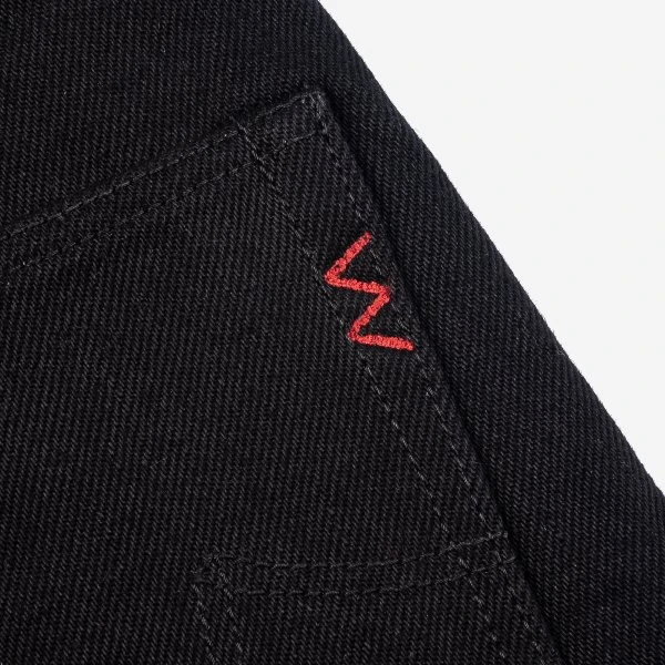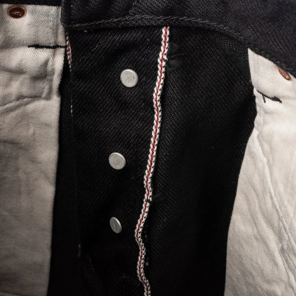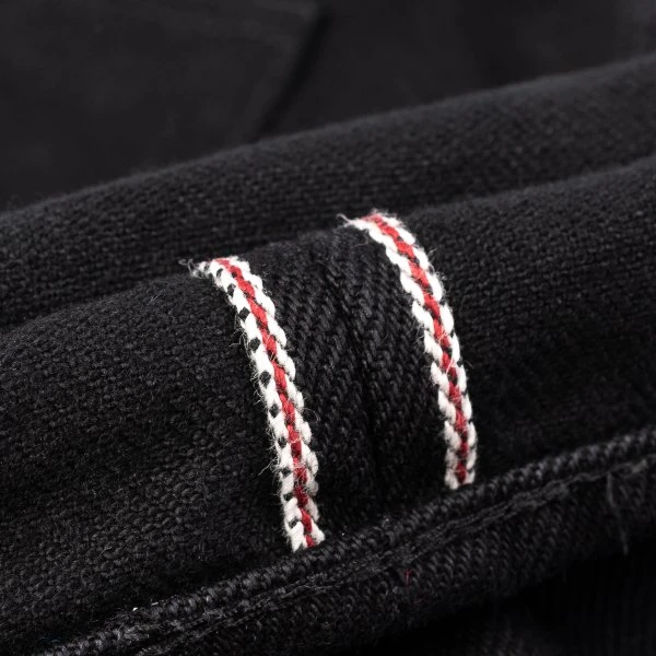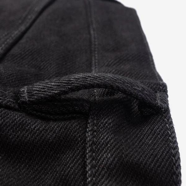 Our straight cut jean, made out of 21oz “Super Black Fades to Grey” (SBG) selvedge denim. This denim has a black sulphur dyed warp and a black reactive dyed weft. With time the warp will fade but the weft won’t. It is heavy, tough, yet soft and extremely breathable. Because of the double twisted weft construction, this denim moulds to an individual’s body shape like no other denim.
