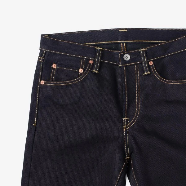Our slim straight jean with a low/medium rise in our indigo/black XHS (extra heavy selvedge) 25oz denim. This ultra heavy denim is at the limit of what can be made and is not for the faint of heart. Super-stiff when new and requires some “breaking-in”- with time and wear it becomes soft, pliable and very comfy. Woven with an indigo warp (that will fade) and a reactive dyed black weft (that won’t fade).