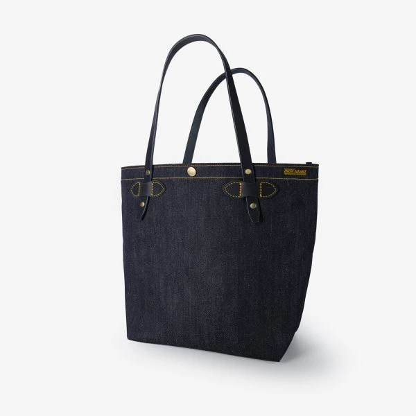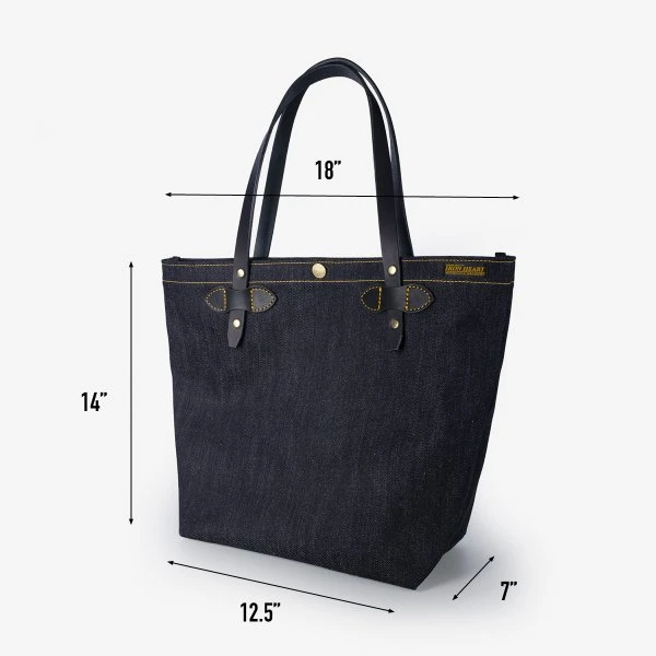 By far the toughest tote bags we’ve ever made, these 25oz extra heavy selvedge models blend classic tote styling with Iron Heart’s signature over-engineered construction. Designed for maximum strength and durability, the main body of the bag is made from our heaviest denim, complimented by rugged features including riveted leather handles, reinforced side seams and brass hardware. Offering generous capacity, this is a versatile tote bag that’s built to stand the test of time, with the appearance of the denim evolving with unique character as the indigo-dyed yarns gradually wear and fade.