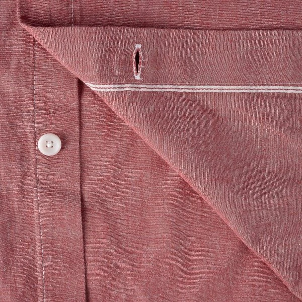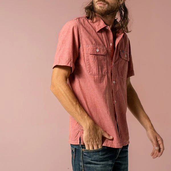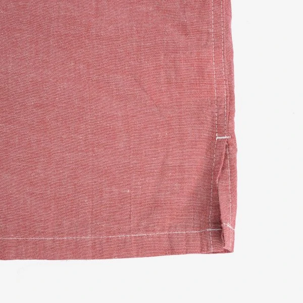Based on our mechanic shirt cut, our short sleeved summer shirt is made from a lightweight 4oz selvedge cloth, woven on traditional shuttle looms from a blend of cotton, linen and rayon. With the latter added to the weave to improve garment drape, the resulting fabric is incredibly soft, floaty and breathable – perfect for warmer climates. Finished with contrast white stitching and buttons, other notable features include pre-folded sleeve hems (held in place with tack stitches) and a straight hemline with split seam gussets.