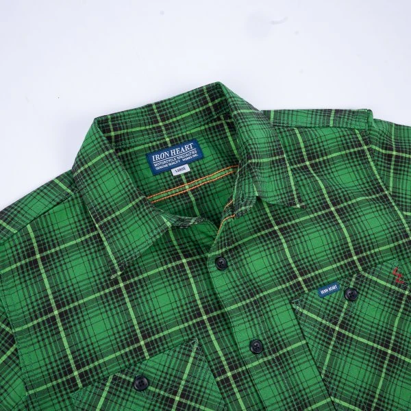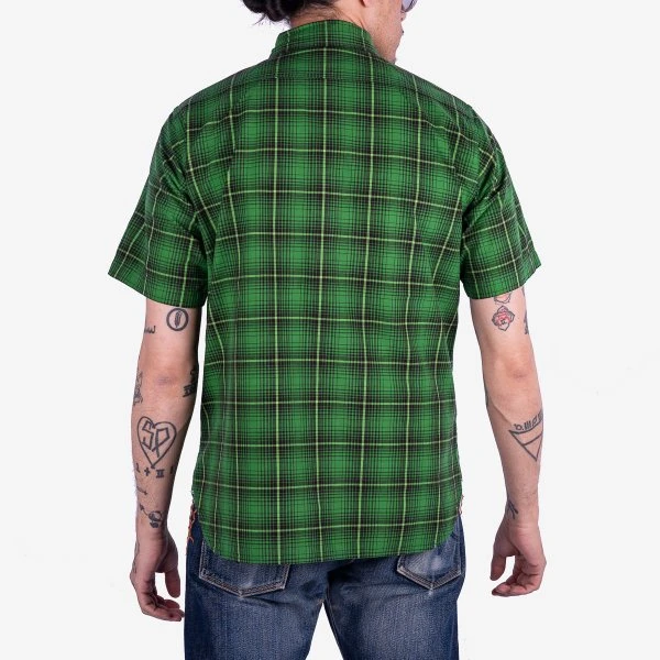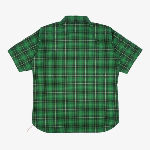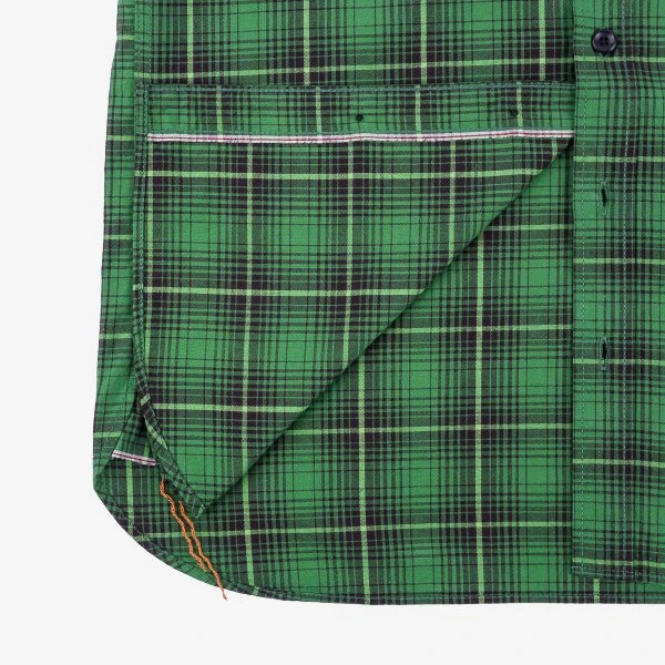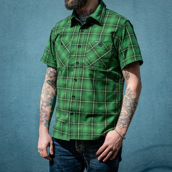 Our short sleeved work shirt cut, made from a lightweight 5oz selvedge cloth featuring a 1970s inspired check pattern. Blending a rich palette of greens and black, the yarns are reactive dyed for maximum vibrancy. However, by using a newly developed reactive dyeing technique, we’re able to utilise these deep shades whilst also allowing the colours to mature and fade as if they were sulphur dyed. Complemented by tonal stitching and white four-hole buttons, the result is an eye catching summer shirt with more than a hint of retro style.