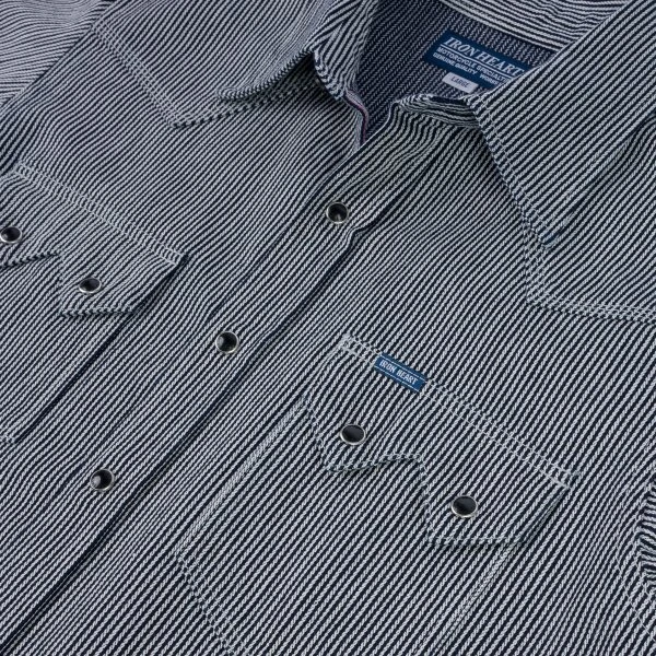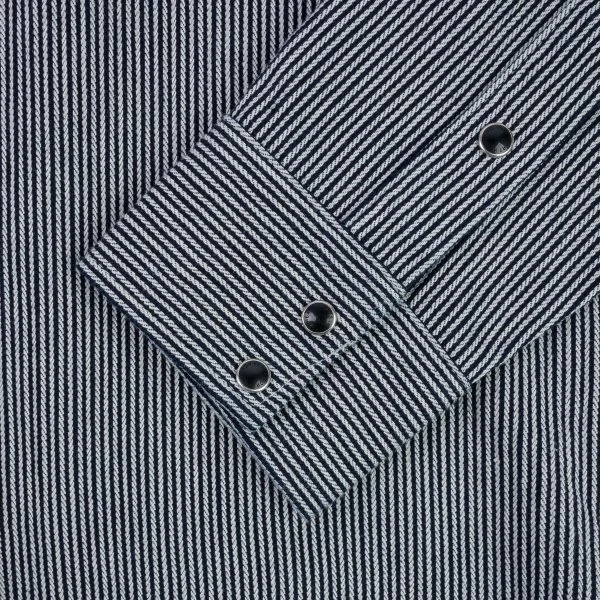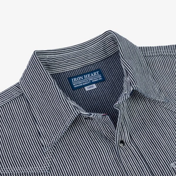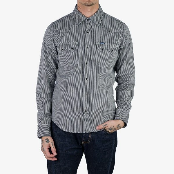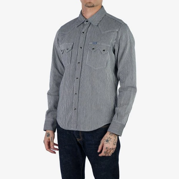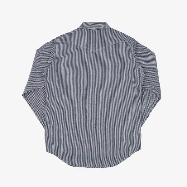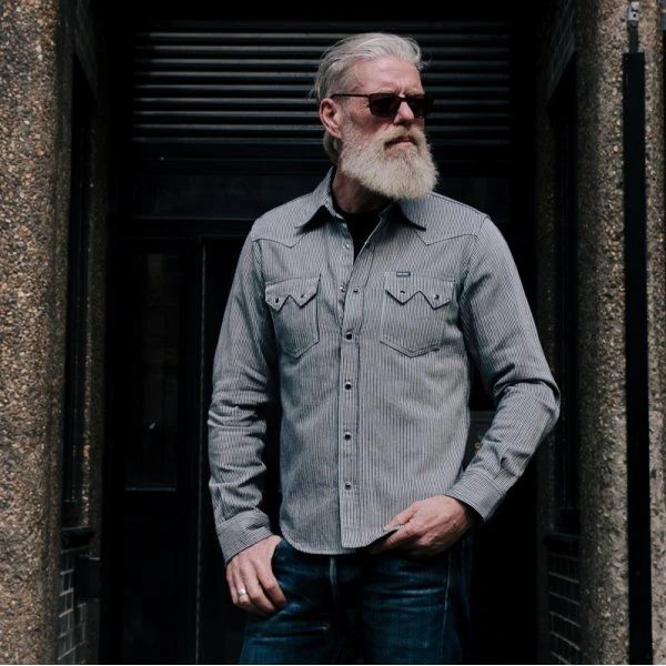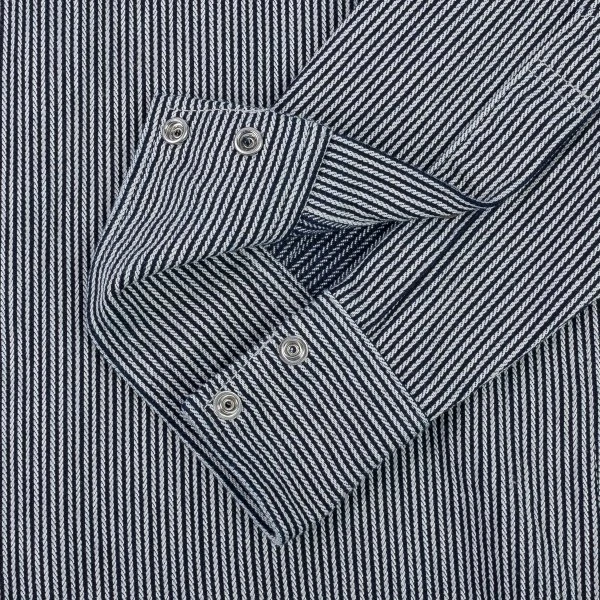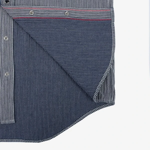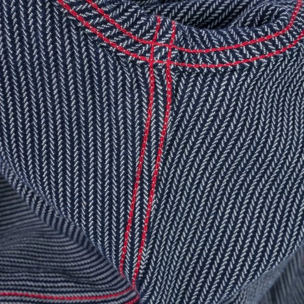 The origins of hickory stripe dates back to the style of cloth used to make overalls and hats worn by railroad workers in the Wild West – a very hard wearing fabric with the indigo stripes intended to disguise oil stains. Seen here on our sawtooth western cut, this particular 8oz herringbone hickory fabric has been woven using a dobby loom to create more texture and character. The weft is reactive dyed to resist fading, whilst the warp has been through the indigo rope dye process 7 times, meaning the colour will start to fade very quickly.