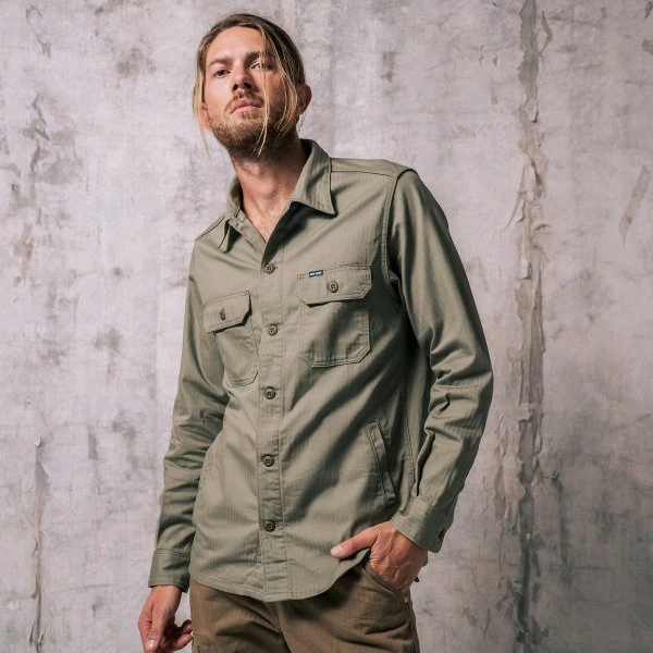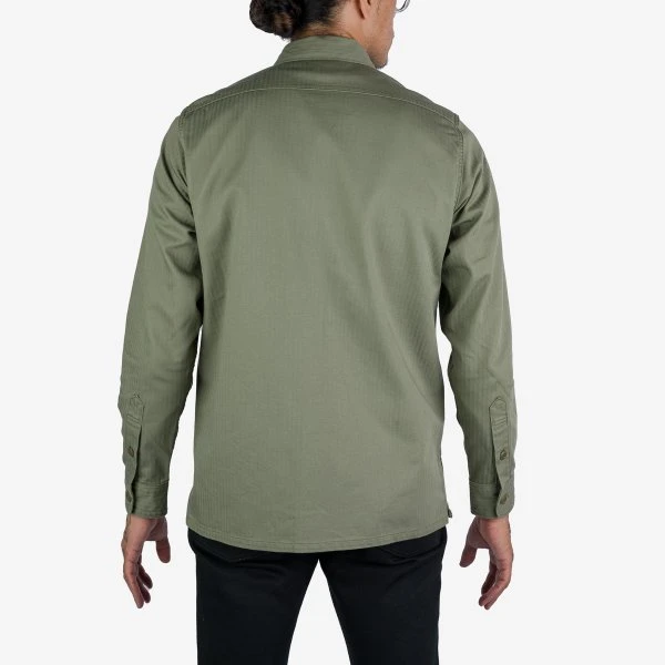 Our military-style CPO cut, constructed from 9oz Japanese Herringbone cotton. The weight and weave of the cloth is inspired by the HBT (Herringbone Twill) fabrics first utilised in 1940s military uniforms – lightweight and very breathable, but also incredibly hardwearing. For a more contemporary appearance, we’ve cut the shirt in a more fitted silhouette, utilising sulphur dyed yarns to allow the colour to gradually fade through wear and washing. As with most of our CPO cuts, along with the button fastening chest pockets, this shirt features side hand warmer pockets for added versatility.