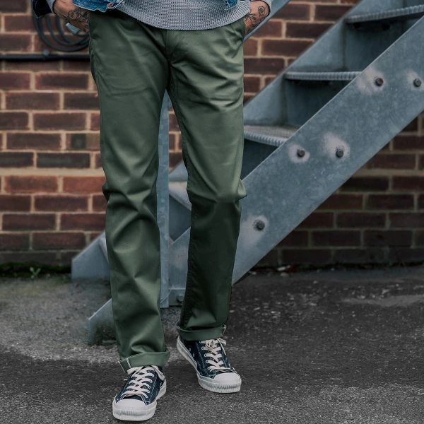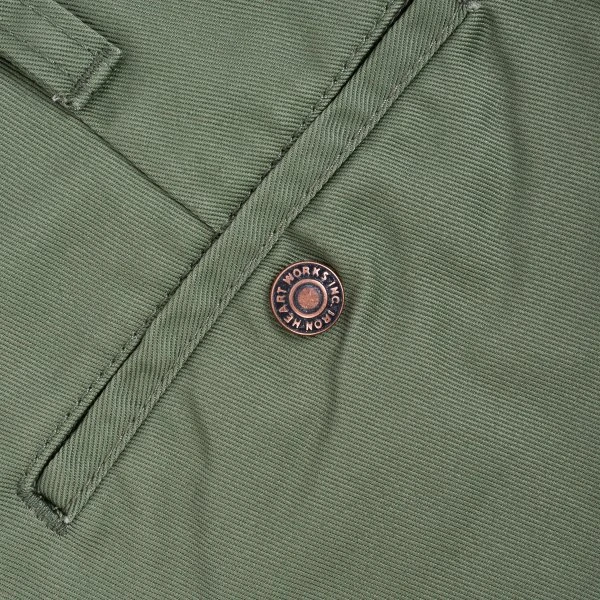 Chinos take their name from the fabric they are made from. Chino cloth is a cotton twill originally developed for the military. This version of what is now a classic casual pant is made from 9oz Japanese selvedge chino cloth. Iron Heart offers a number of different chino pants, this is our slim tapered, or ‘777’ cut.