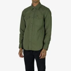 Our western-style CPO shirt, made from 9oz military cotton serge. Lightweight but very durable, this fabric has been woven with a thinner warp yarn and thicker, uneven weft to create a more heavily textured weave. The yarns have been sulphur dyed, meaning that just like an authentic vintage military shirt, the colour will mellow and fade through wear and washing. Being our CPO cut, this shirt offers a little more length in the body than our standard western cut, with additional side hand warmer pockets.