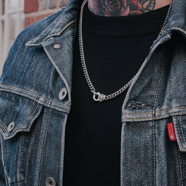A weighty, handcrafted twisted curb chain bracelet made from solid .925 sterling silver. Each link is individually coupled and hand-welded together, creating a solid flowing band that is secured by a swivel-hook locking mechanism, set with a signature rosette. Each GOOD ART HLYWD piece is dipped in sulphuric acid before they are hand-burnished, creating an understated blackened contrast against the impeccably polished highlights.