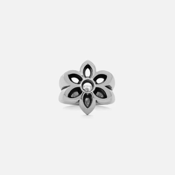 Heavyweight, hand-crafted solid cast .925 sterling silver ring with contoured cutout signature rosette and GOOD ART HLYWD hallmark. Each GOOD ART HLYWD piece is dipped in sulphuric acid before they are hand-burnished, creating an understated blackened contrast against the impeccably polished highlights.