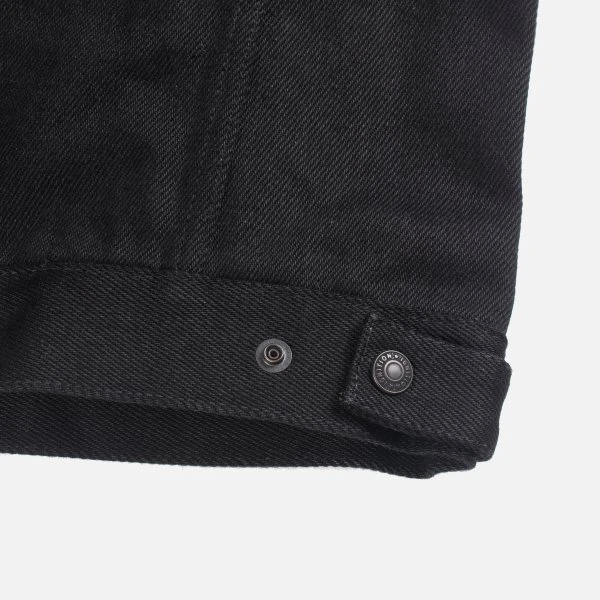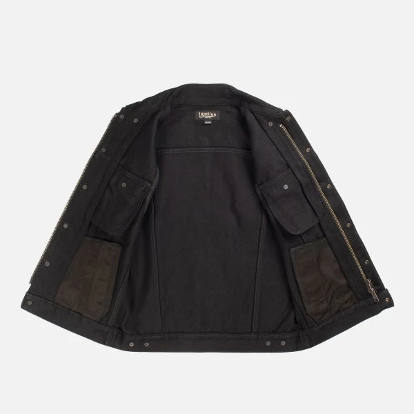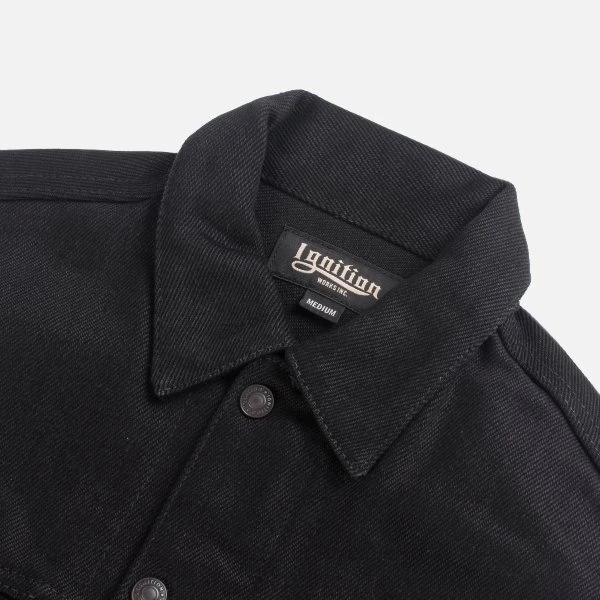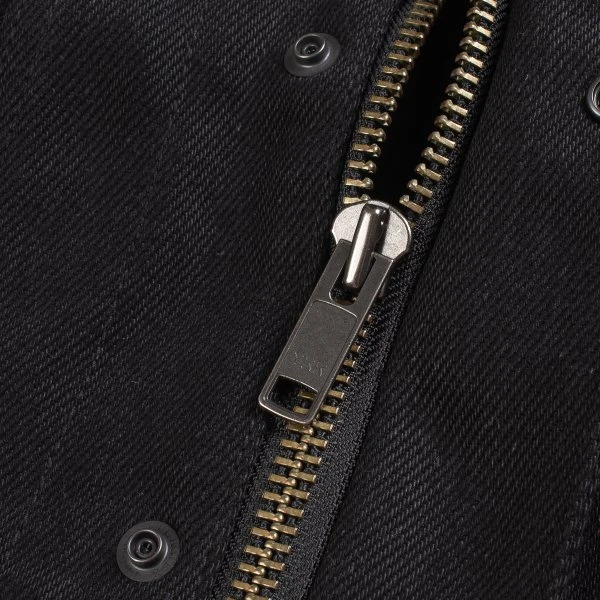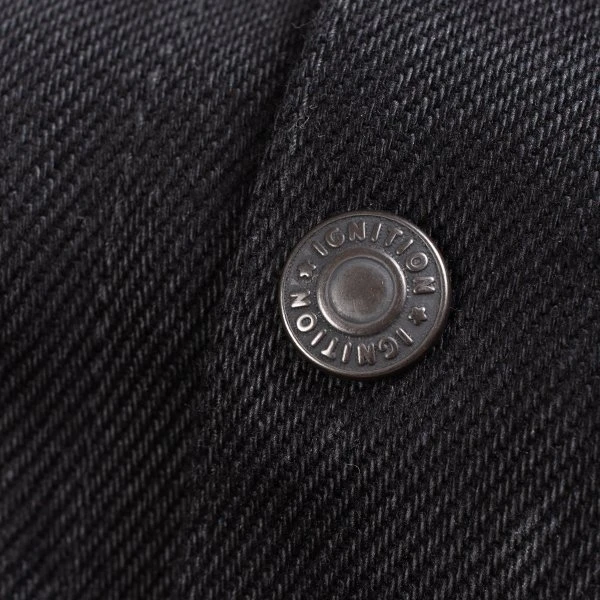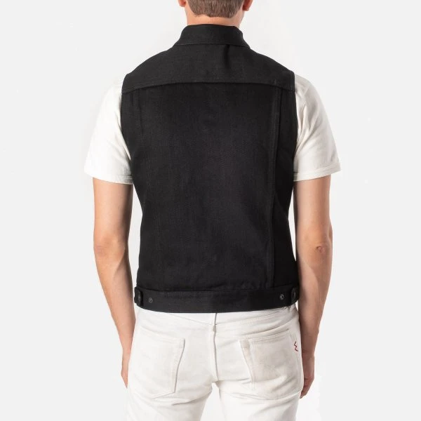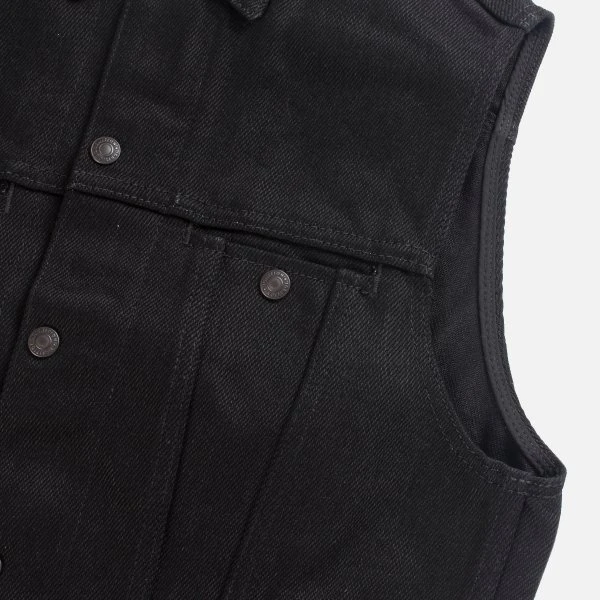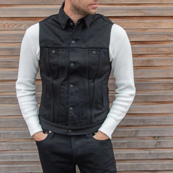 20oz Japanese denim Tracker vest by Ignition Works (Works Inc and Ken’s Factory USA collaboration). Designed for the track with the bike rider in mind, with four external pockets, two internal pockets, a two-way zip front placket with snap closures, and a snap-down collar. The warp is black rope dyed and the weft is black cone (cheese) dyed. Over time this denim will fade to grey.
