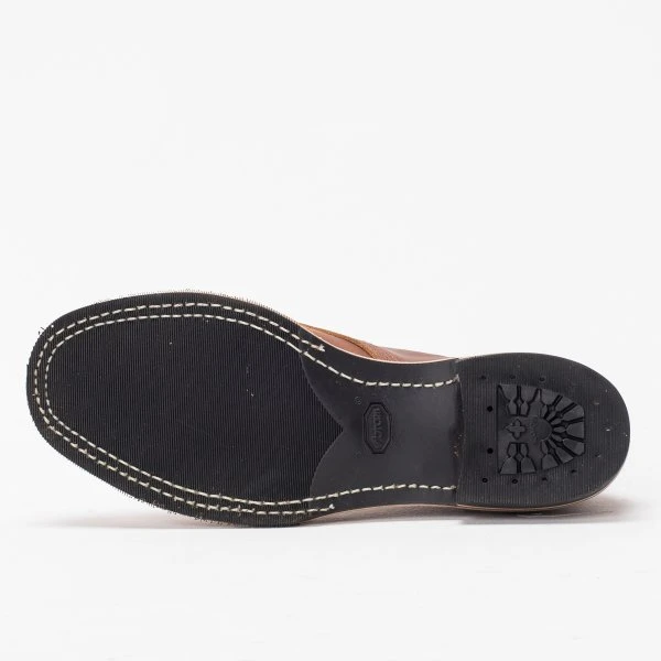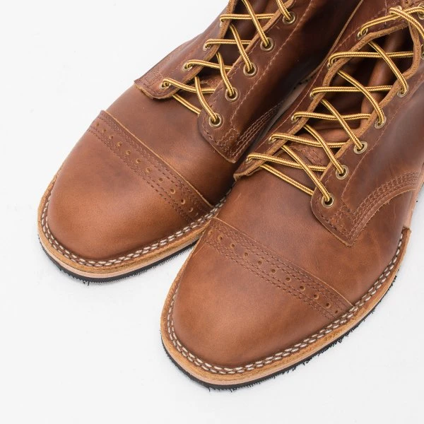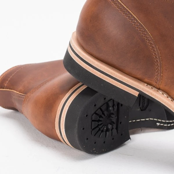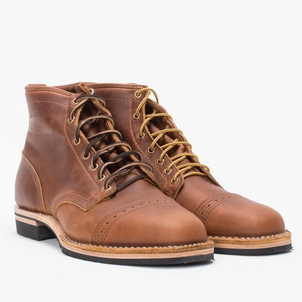 7″ smooth-out British tan domain leather Wesco® boots with brogue toe cap, #269 Vibram sole, 1″ heel, and solid brass hardware. Smooth-out British tan domain is a dry leather that can be polished to a high shine or left to age for a natural patina.