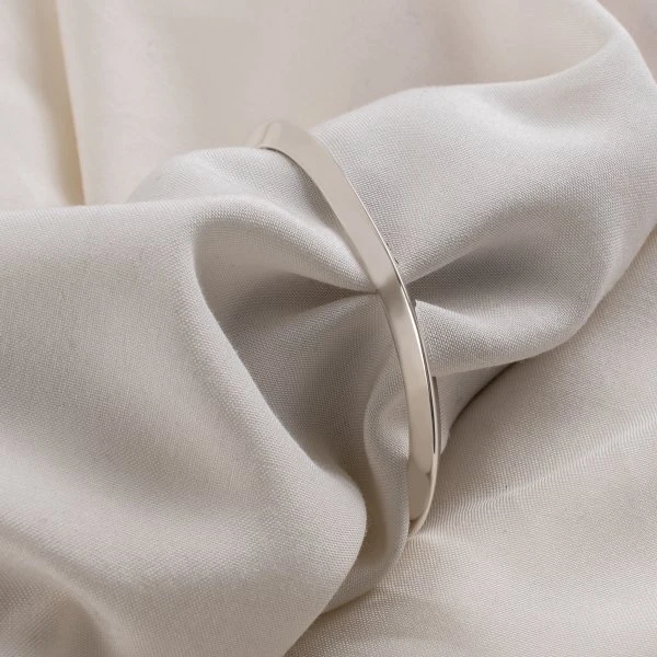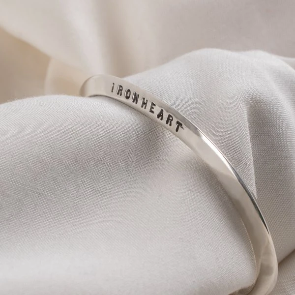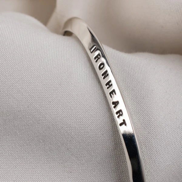 Made from solid sterling .925 silver, our “V” profile bangle features a triangular cross section which gently tapers and flattens out towards each end. Simple “IRON HEART” lettering is debossed onto one face, creating a subtle, yet striking piece.