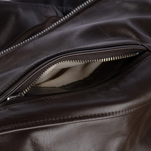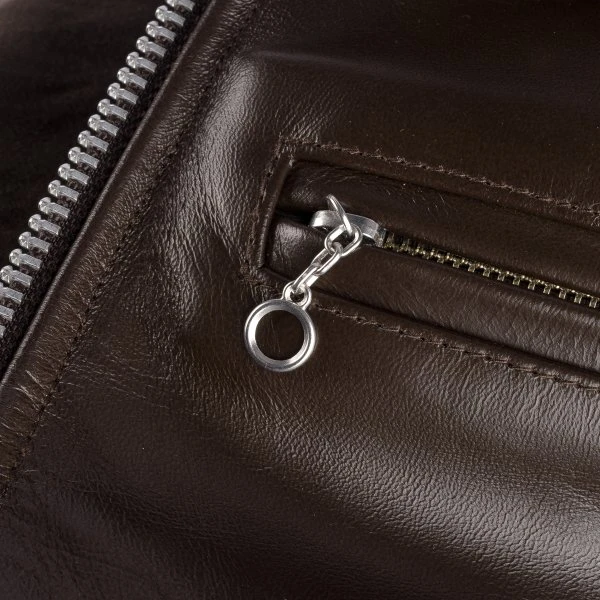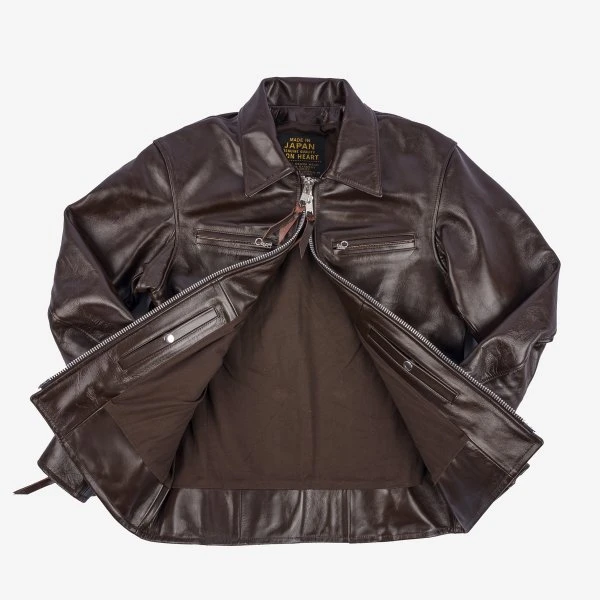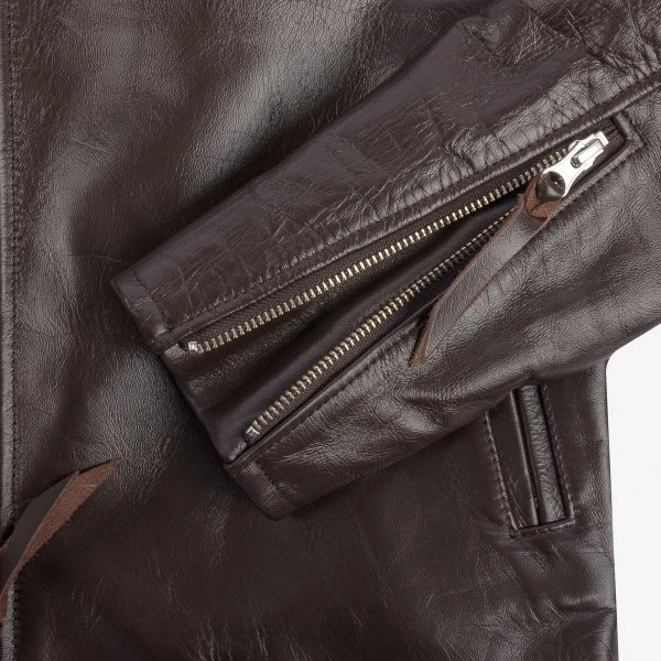 Constructed from premium vegetable tanned horsehide, the leather used to create this Iron Heart original design jacket is sourced from Himeji, the tanning capital of Japan. Pigment dyed brown – meaning that once the pigment fades out, the natural leather will begin to show underneath – this is a modified rider’s jacket, featuring a classic point collar, zippered pockets and a cotton duck lining. Bi-swing pleated shoulders have been integrated for increased mobility, whilst YKK zippers for the main zip and cuffs ensure that the hardware matches the supreme quality of the leather. An understated rider’s jacket offering the perfect blend of functionality and vintage style.