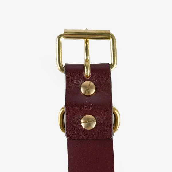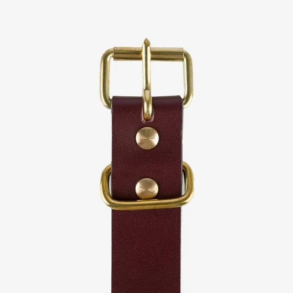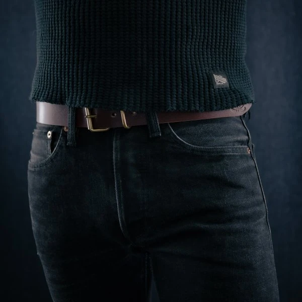 Brown full-dyed leather belt with ellipse punch holes and a classic single prong brass roller buckle and keeper – handmade by our good friends Obbi Good Label in Singapore. Constructed with 12oz full-grain cowhide leather, which will age naturally with unique characteristics. Â