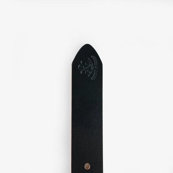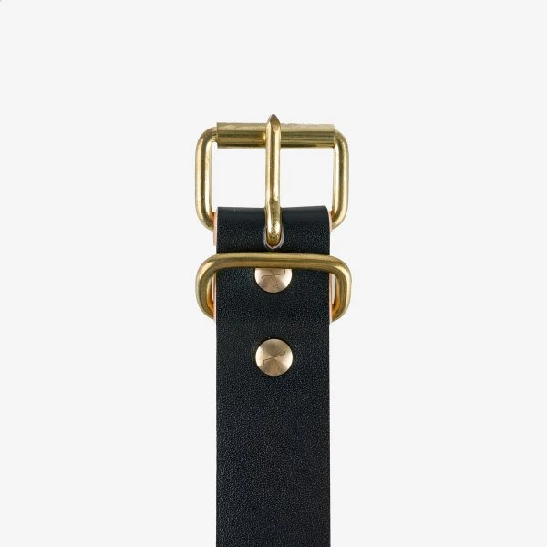 Black hand-dyed leather belt with ellipse punch holes and a classic single prong brass roller buckle and keeper – handmade by our good friends Obbi Good Label in Singapore. Constructed with 12oz full-grain cowhide leather, which will age naturally with unique characteristics.
