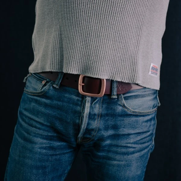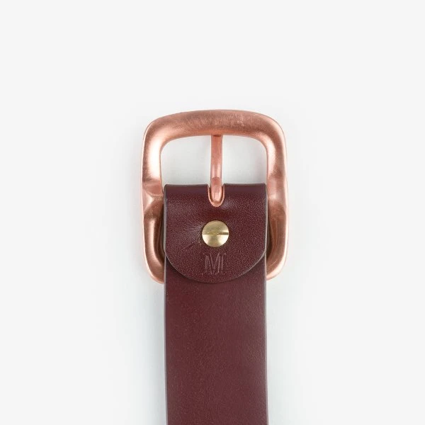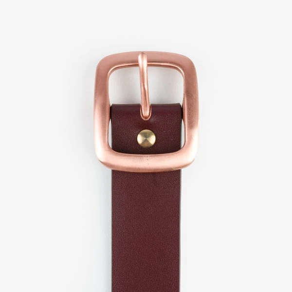 Brown full-dyed leather belt with ellipse punch holes and a single prong solid copper garrison buckle – handmade by our good friends Obbi Good Label in Singapore. Constructed with 12oz full-grain cowhide leather, which will age naturally with unique characteristics. Whilst shiny when new, due to the nature of copper, the buckle will darken over time as the metal begins to oxidise. Â