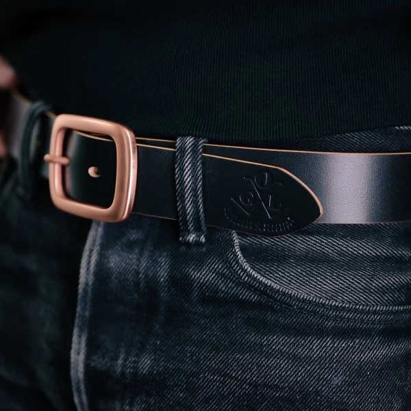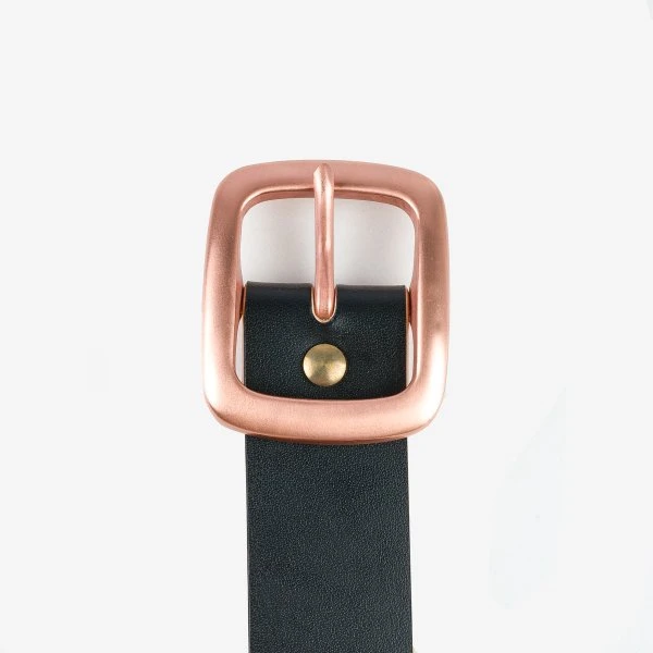 Black hand-dyed leather belt with ellipse punch holes and a single prong solid copper garrison buckle – handmade by our good friends Obbi Good Label in Singapore. Constructed with 12oz full-grain cowhide leather, which will age naturally with unique characteristics. Whilst shiny when new, due to the nature of copper the buckle will darken over time as the metal begins to oxidise. Â
