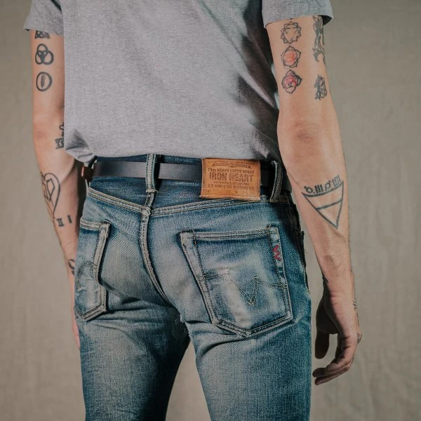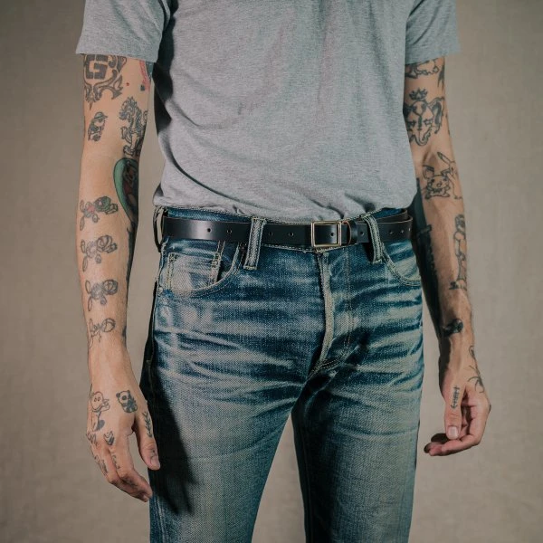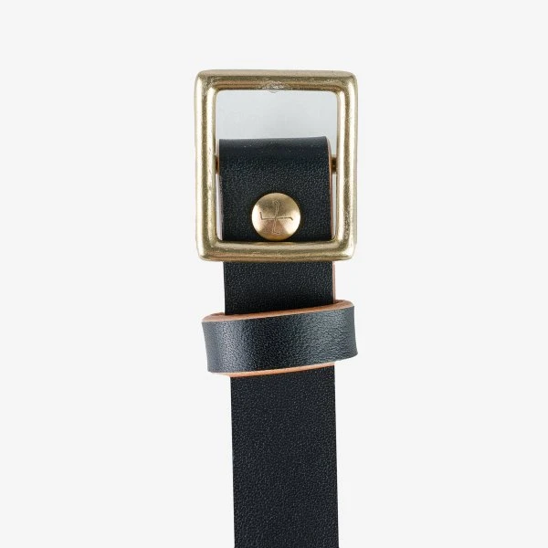 Black hand-dyed leather belt with circle punch holes, a ‘prongless’ brass roller buckle and a leather keeper – handmade by our good friends Obbi Good Label in Singapore. The unique buckle design offers a very clean look, meaning that this slimline belt is ideal for formal wear. Constructed with 12oz full-grain cowhide leather, which will age naturally with unique characteristics.
