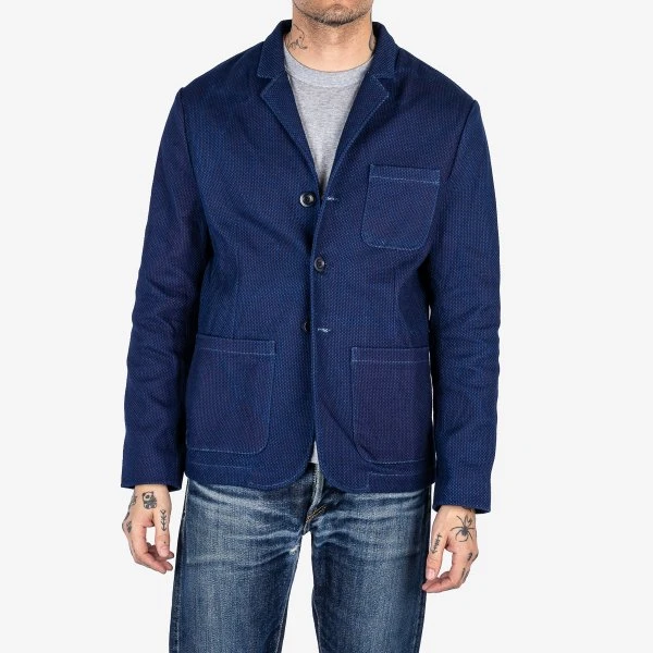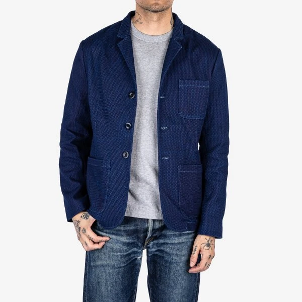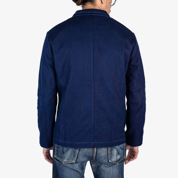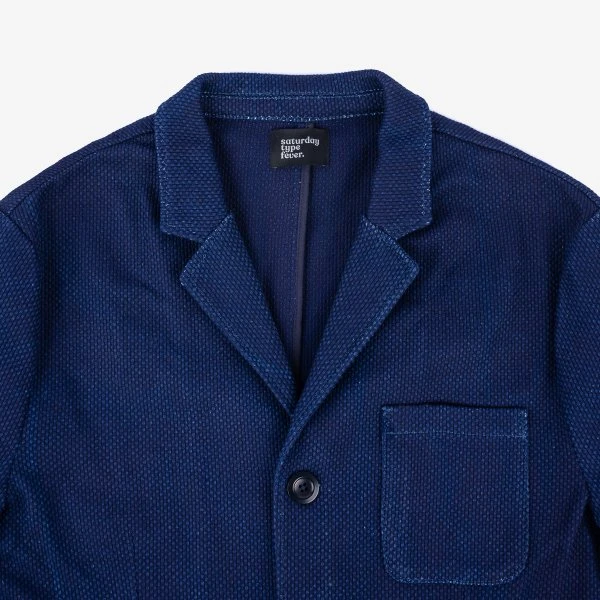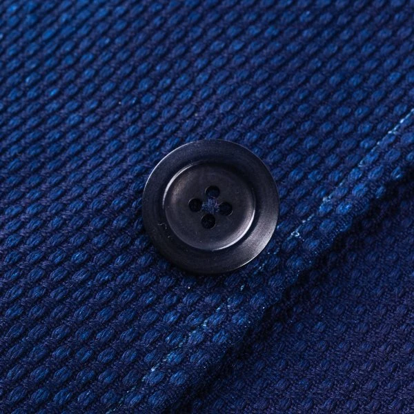 Designed to smarten up a casual look, this unstructured blazer is handmade in London and perfectly complements a pair of denim jeans or chinos. Constructed from an intricately woven Japanese sashiko cloth which is woven in Shiga prefecture and hand dyed in Fukuyama city. Â The hand-dyeing process results in subtle variations in the indigo tone, adding unique characteristics to each shirt and an appearance that will quickly evolve as the made-to fade fabric ages. Other features include corozo nut buttons, tonal stitching, a single chest pocket and two waist pockets with hidden hand warmers.