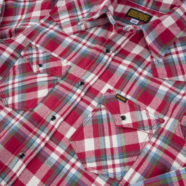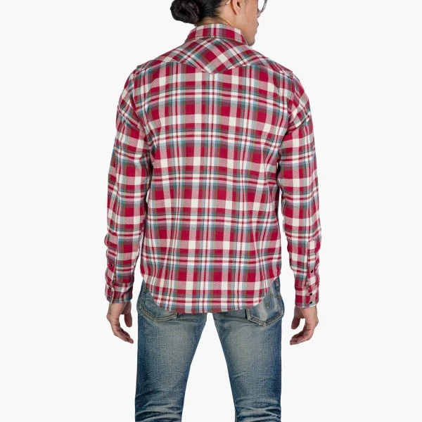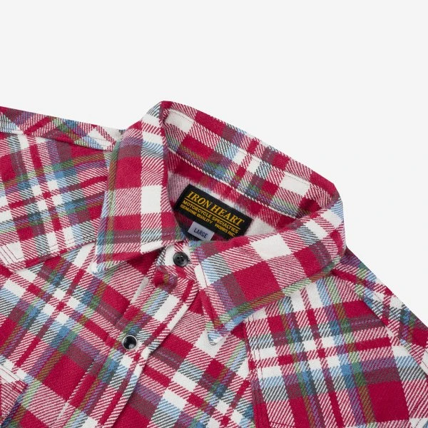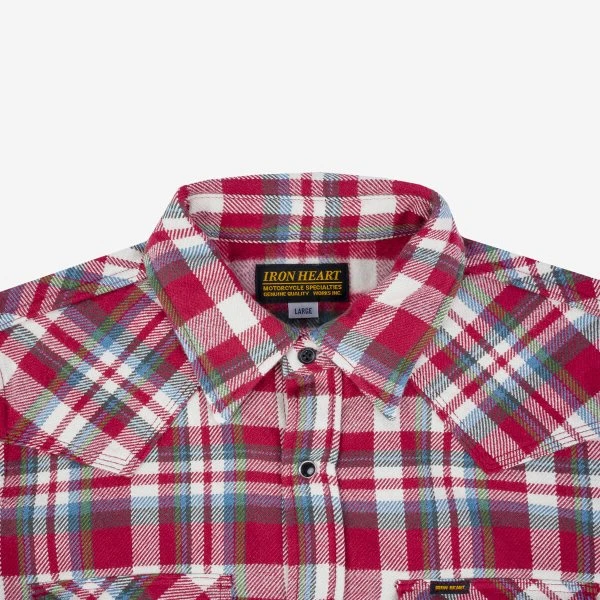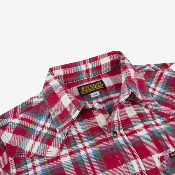 To a great extent, our ultra heavy flannel (UHF) shirts define Iron Heart: heavy, rugged, but amazingly wearable. The 12oz fabric is woven with Aspero cotton from the foothills of the Andes mountains. We double brush it on the inside and single brush it on the outside, resulting in a very soft yet substantial, thick, warm and windproof flannel. This shirt is a wardrobe staple – a western cut in red crazy check.