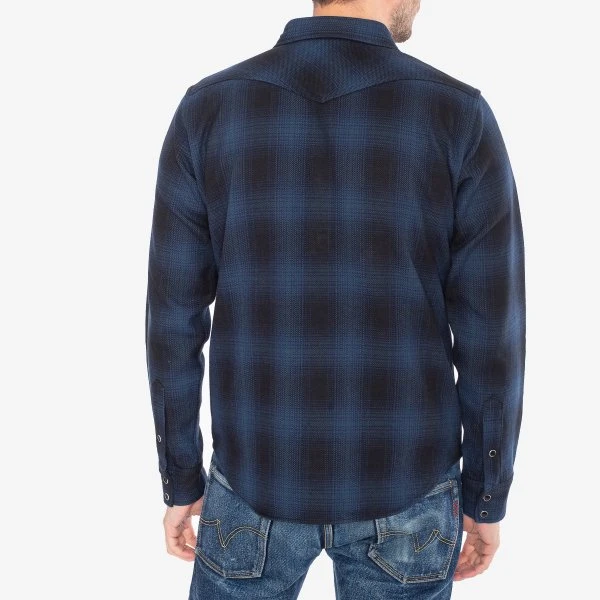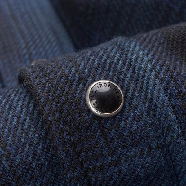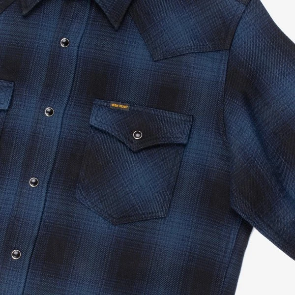 We’re very proud of our ultra heavy flannel (UHF) shirts. This western shirt is in an exclusive Iron Heart designed navy blue/black ombré check 12oz fabric, woven from Aspero cotton from the foothills of the Andes mountains, double brushed on the inside and single brushed on the outside, resulting in a very soft yet heavy, thick, warm and windproof flannel.
