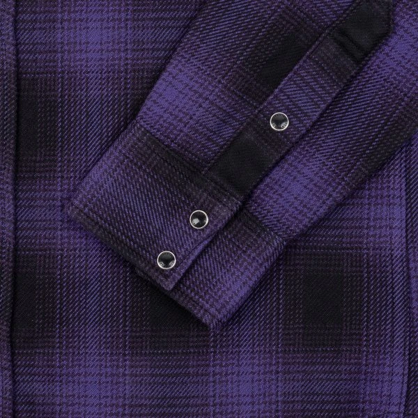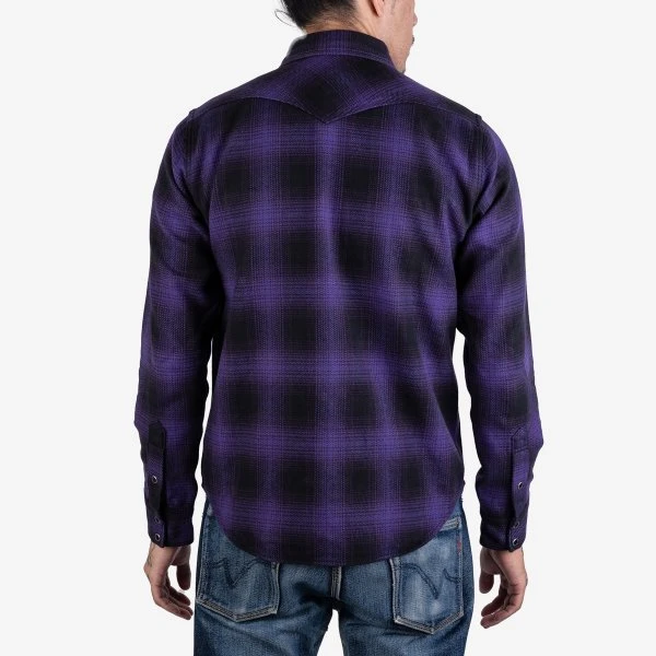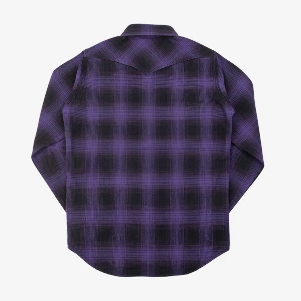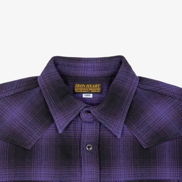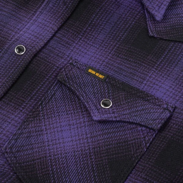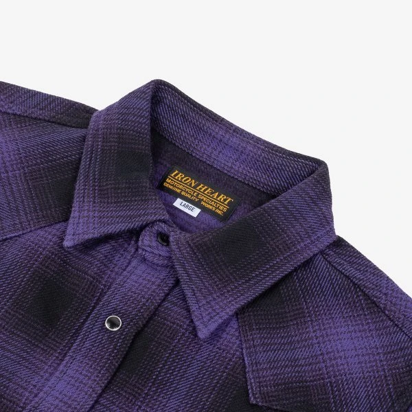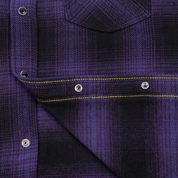 We’re very proud of our ultra heavy flannel (UHF) shirts. This western shirt is in an exclusive Iron Heart designed purple/black ombré check 12oz fabric in collaboration with Fallen Acorn Brewing Co. Woven from Aspero cotton from the foothills of the Andes mountains, double brushed on the inside and single brushed on the outside, resulting in a very soft yet heavy, thick, warm and windproof flannel.