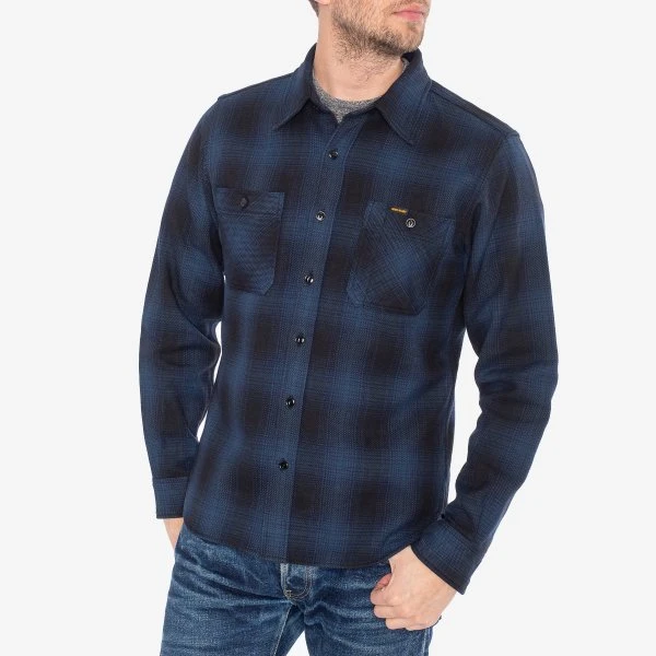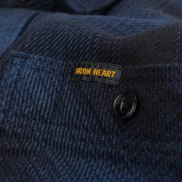 We’re very proud of our ultra heavy flannel (UHF) shirts. This work shirt is in an exclusive Iron Heart designed navy blue/black ombré check 12oz fabric, woven from Aspero cotton from the foothills of the Andes mountains, double brushed on the inside and single brushed on the outside, resulting in a very soft yet heavy, thick, warm and windproof flannel.