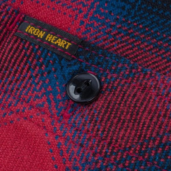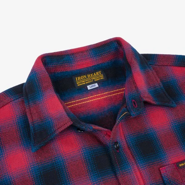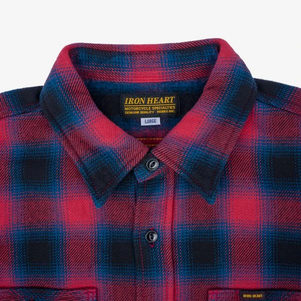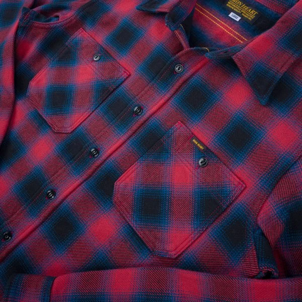 To a great extent, our ultra heavy flannel (UHF) shirts define Iron Heart: heavy, rugged, but amazingly wearable. The 12oz fabric is woven with Aspero cotton from the foothills of the Andes mountains. We double brush it on the inside and single brush it on the outside, resulting in a very soft yet substantial, thick, warm and windproof flannel. This shirt is a wardrobe staple – a work cut in red ombré check.