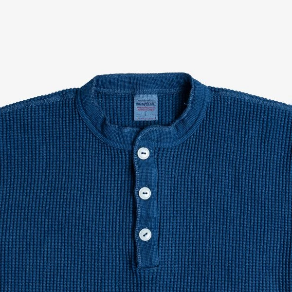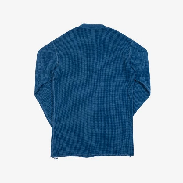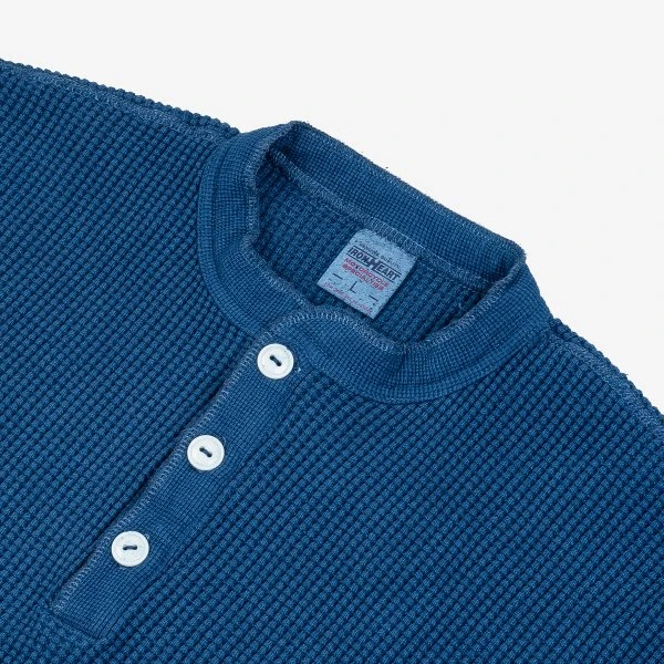 Our classic henley thermal, constructed from a white 100% cotton, waffle knit woven fabric that is soft, warm and comfortable. This version has been indigo dipped, creating a deep indigo tone throughout, which over time will fade as the indigo leaches from the fabric.