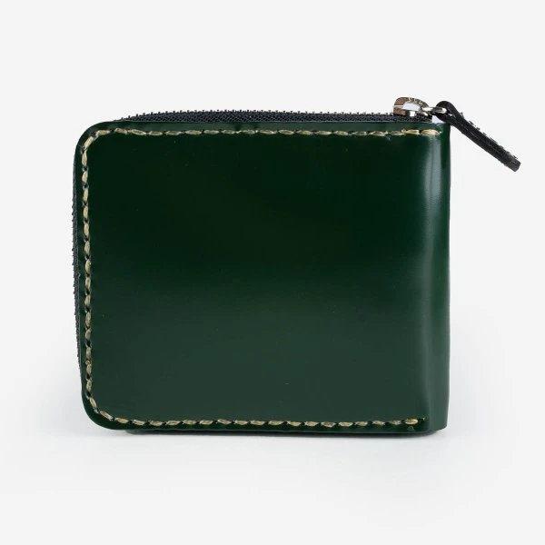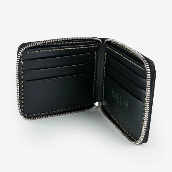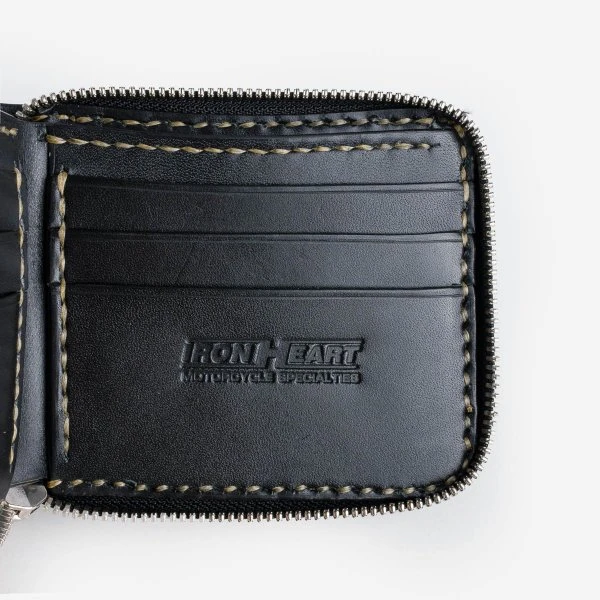 Super smooth and highly durable Shell Cordovan wallet with hand-sewn goat tendon stitching, cowhide leather interior, six card slots, and banknote section. The streamlined design ensures maximum comfort when stored in the back pocket of slim cut jeans. Finished with debossed Iron Heart Motorcycle Specialties and heavyweight YKK zipper.
