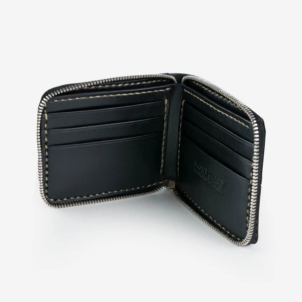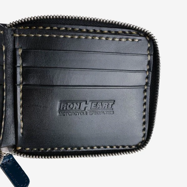 Super smooth and highly durable Shell Cordovan wallet with hand-sewn goat tendon stitching, cowhide leather interior, six card slots, and banknote section. The streamlined design ensures maximum comfort when stored in the back pocket of slim cut jeans. Finished with debossed Iron Heart Motorcycle Specialties and heavyweight YKK zipper.